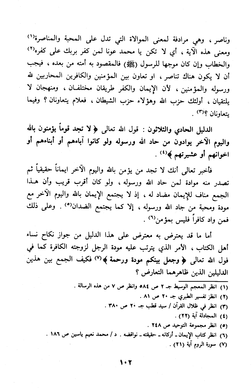 الدليل الحادي والثلاثون: قول الله تعالى: (لا تَجِدُ قَوْمًا يُؤْمِنُونَ بِاللهِ وَالْيَوْمِ الآخِرِ يُوَادُّونَ مَنْ حَادَّ اللهَ وَرَسُولَهُ وَلَوْ كَانُوا آبَاءَهُمْ أَوْ أَبْنَاءَهُمْ أَوْ إِخْوَانَهُمْ أَوْ عَشِيرَتَهُمْ) [المجادلة: 22].