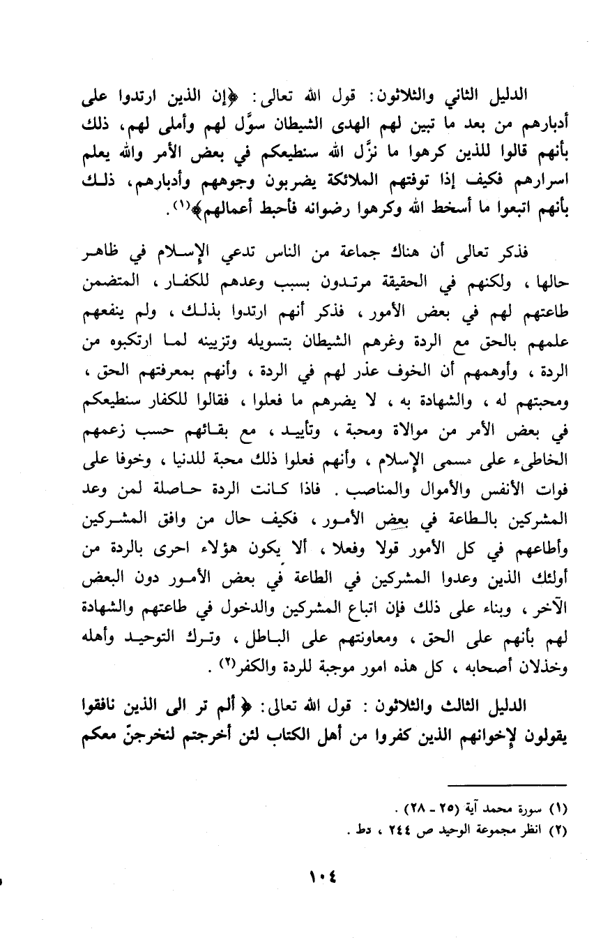 الدليل الثاني والثلاثون: قول الله تعالى: (إِنَّ الَّذِينَ ارْتَدُّوا عَلَى أَدْبَارِهِمْ مِنْ بَعْدِ مَا تَبَيَّنَ لَهُمُ الْهُدَى الشَّيْطَانُ سَوَّلَ لَهُمْ وَأَمْلَى لَهُمْ * ذَلِكَ بِأَنَّهُمْ قَالُوا لِلَّذِينَ كَرِهُوا مَا نَزَّلَ اللهُ سَنُطِيعُكُمْ فِي بَعْضِ الأَمْرِ وَاللهُ يَعْلَمُ إِسْرَارَهُمْ * فَكَيْفَ إِذَا تَوَفَّتْهُمُ الْمَلائِكَةُ يَضْرِبُونَ وُجُوهَهُمْ وَأَدْبَارَهُمْ * ذَلِكَ بِأَنَّهُمُ اتَّبَعُوا مَا أَسْخَطَ اللهَ وَكَرِهُوا رِضْوَانَهُ فَأَحْبَطَ أَعْمَالَهُمْ) [محمد: 25 - 28].