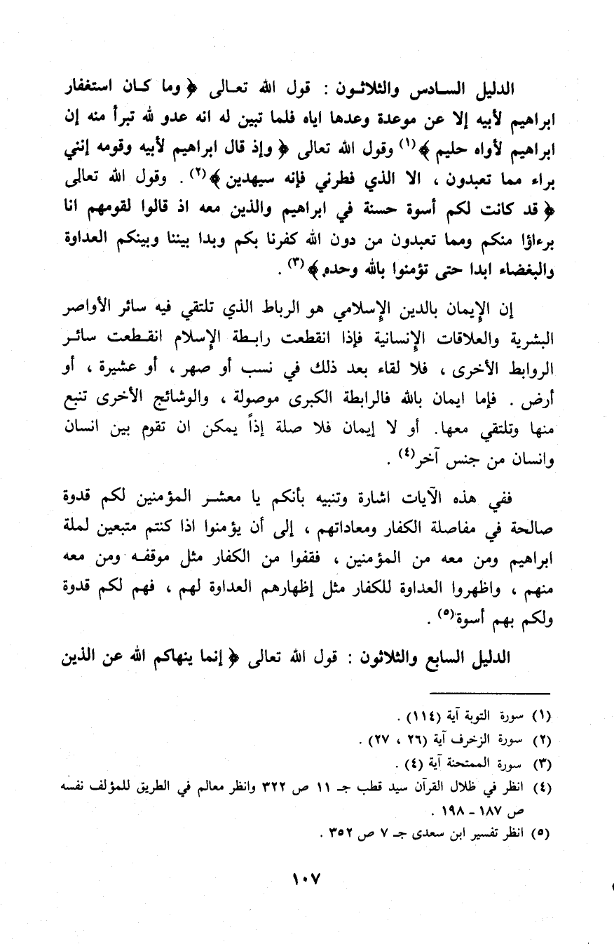 الدليل السادس والثلاثون: قول الله تعالى: (وَمَا كَانَ اسْتِغْفَارُ إِبْرَاهِيمَ لأَبِيهِ إِلا عَنْ مَوْعِدَةٍ وَعَدَهَا إِيَّاهُ فَلَمَّا تَبَيَّنَ لَهُ أَنَّهُ عَدُوٌّ للهِ تَبَرَّأَ مِنْهُ إِنَّ إِبْرَاهِيمَ لأَوَّاهٌ حَلِيمٌ) [التوبة: 114] وقول الله تعالى: (وَإِذْ قَالَ إِبْرَاهِيمُ لأَبِيهِ وَقَوْمِهِ إِنَّنِي بَرَاءٌ مِمَّا تَعْبُدُونَ * إِلا الَّذِي فَطَرَنِي فَإِنَّهُ سَيَهْدِينِ) [الزخرف: 26، 27] وقول الله تعالى: (قَدْ كَانَتْ لَكُمْ أُسْوَةٌ حَسَنَةٌ فِي إِبْرَاهِيمَ وَالَّذِينَ مَعَهُ إِذْ قَالُوا لِقَوْمِهِمْ إِنَّا بُرَآءُ مِنْكُمْ وَمِمَّا تَعْبُدُونَ مِنْ دُونِ اللهِ كَفَرْنَا بِكُمْ وَبَدَا بَيْنَنَا وَبَيْنَكُمُ الْعَدَاوَةُ وَالْبَغْضَاءُ أَبَدًا حَتَّى تُؤْمِنُوا بِاللهِ وَحْدَهُ) [الممتحنة: 4].