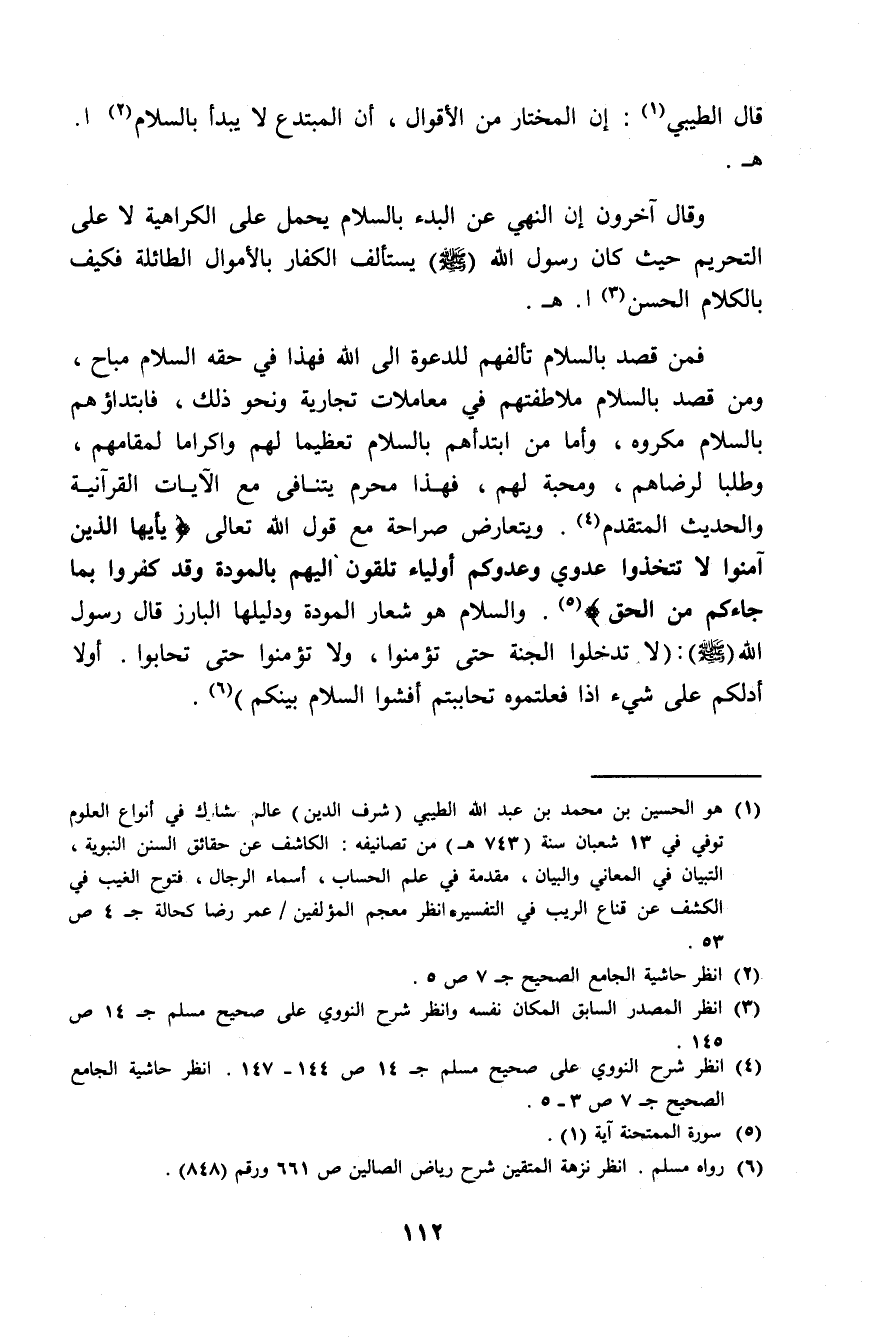 قال الطيبي (¬1): إن المختار من الأقوال، أن المتبدع لا يبدأ بالسلام (¬2) اهـ.