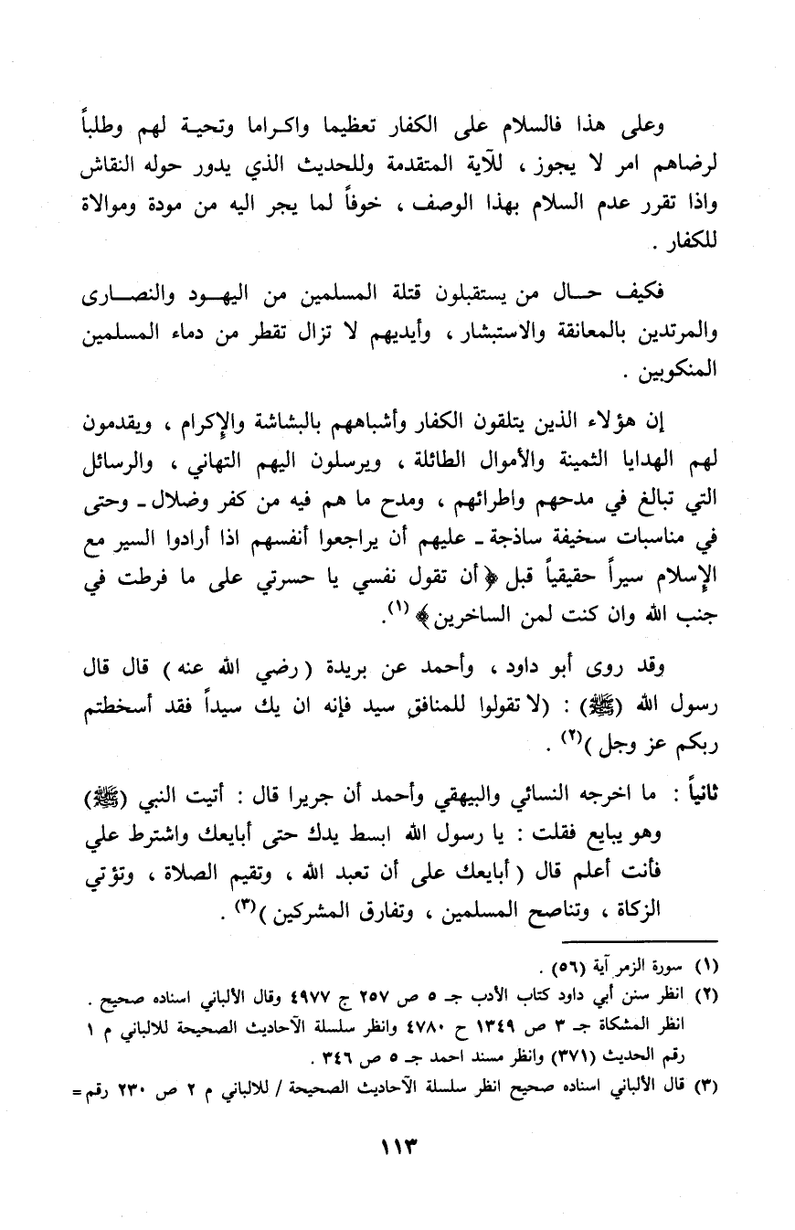 وعلى هذا فالسلام على الكفار تعظيما وإكراما وتحية لهم وطلبا لرضاهم أمر لا يجوز للآية المتقدمة وللحديث الذي يدور حوله النقاش وإذا تقرر عدم السلام بهذا الوصف، خوفا لما يجر إليه من مودة وموالاة للكفار.