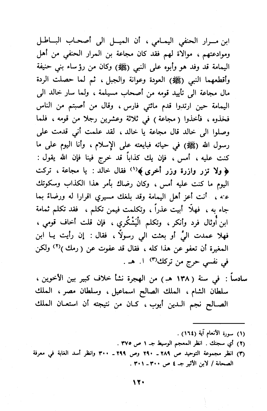 ابن مرار الحنفي اليمامي، أن الميل إلى أصحاب الباطل وموادعتهم، موالاة لهم فقد كان مجاعة بن المرار الحنفي من أهل اليمامة قد وفد هو وأبوه على النبي - صلى الله عليه وسلم - وكان من رؤساء بني حنيفة وأقطعهما النبي - صلى الله عليه وسلم - العودة وعوانة والجبل، ثم لما حصلت الردة مال مجاعة إلى تأييد قومه من أصحاب مسيلمة، ولما سار خالد إلى اليمامة حين ارتدوا قدَّم مائتي فارس، وقال: من أصبتم من الناس فخذوه، فأخذوا (مجاعة) في ثلاثة وعشرين رجلا من قومه، فلما وصلوا إلى خالد قال مجاعة يا خالد، لقد علمت أني قدمت على رسول الله - صلى الله عليه وسلم - في حياته فبايعته على الإسلام، وأنا اليوم على ما كنت عليه، أمس فإن يك كذابا قد خرج فينا فإن الله يقول: (وَلا تَزِرُ وَازِرَةٌ وِزْرَ أُخْرَى) [الأنعام: 164] فقال خالد: يا مجاعة، تركت اليوم ما كنت عليه أمس، وكان رضاك بأمر هذا الكذاب وسكوتك عنه، أنت أعز أهل اليمامة وقد بلغك مسيري إقرارًا له ورضاء بما جاء به، فهلا أبيت عذرا، وتكلمت فيمن تكلم، فقد تكلم ثمامة بن أثال فرد وأنكر، وتكلم اليشكري، فإن قلت أخاف قومي، فهلا عمدت إلي أو بعثت إلى رسولا، فقال: إن رأيت يا ابن المغيرة أن تعفو عن هذا كله، فقال قد عفوت عن رمك (¬1) ولكن في نفسي حرج من تركك (¬2) اهـ.