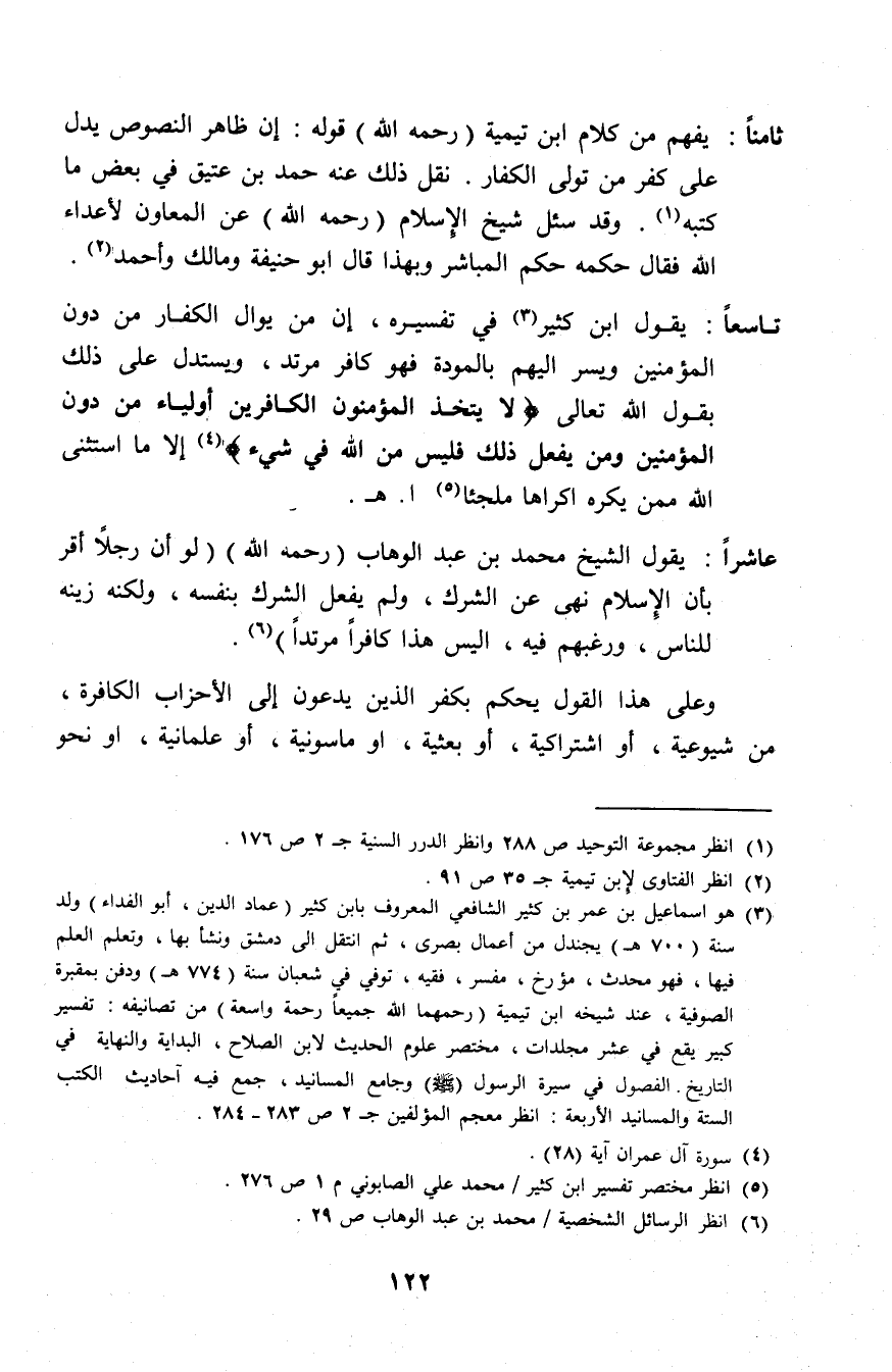 تاسعًا: يقول ابن كثير (¬3) في تفسيره، إن من يوال الكفار من دون المؤمنين ويسر إليهم بالمودة فهو كافر مرتد، ويستدل على ذلك بقول الله تعالى: (لا يَتَّخِذِ الْمُؤْمِنُونَ الْكَافِرِينَ أَوْلِيَاءَ مِنْ دُونِ الْمُؤْمِنِينَ وَمَنْ يَفْعَلْ ذَلِكَ فَلَيْسَ مِنَ اللهِ فِي شَيْءٍ) [آل عمران: 28] إلا ما استثنى الله ممن يكره إكراها ملجئا (¬4) اهـ.