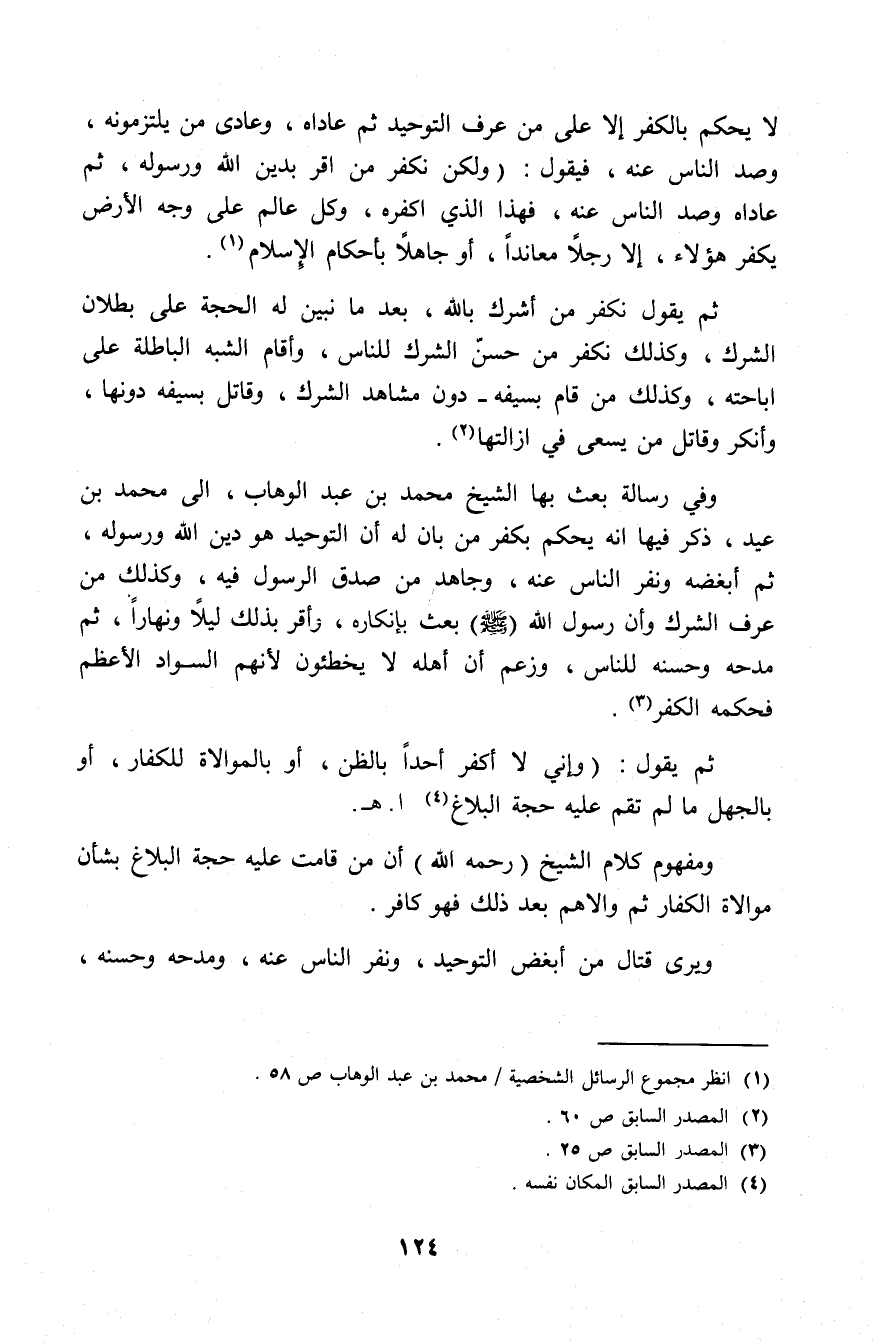 وفي رسالة بعث بها الشيخ محمد بن عبد الوهاب، إلى محمد بن عيد، ذكر فيها أنه يحكم بكفر من بان له أن التوحيد هو دين الله ورسوله، ثم أبغضه ونفر الناس عنه، وجاهد من صدق الرسول فيه، وكذلك من عرف الشرك وأن رسول الله - صلى الله عليه وسلم - بعث بإنكاره، وأقر بذلك ليلاً ونهارًا، ثم مدحه وحسَّنه للناس، زعم أن أهله لا يخطئون لأنهم السواد الأعظم فحكمه الكفر (¬3).