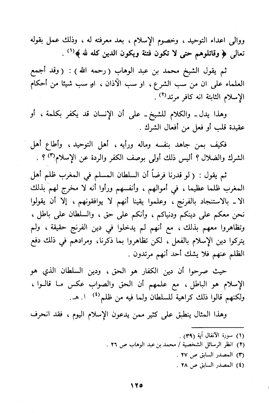 فكيف بمن جاهد بنفسه وماله ورأيه، أهل التوحيد، وأطاع أهل الشرك والضلال؟. أليس ذلك أولى بوصف الكفر والردة عن الإسلام (¬2).