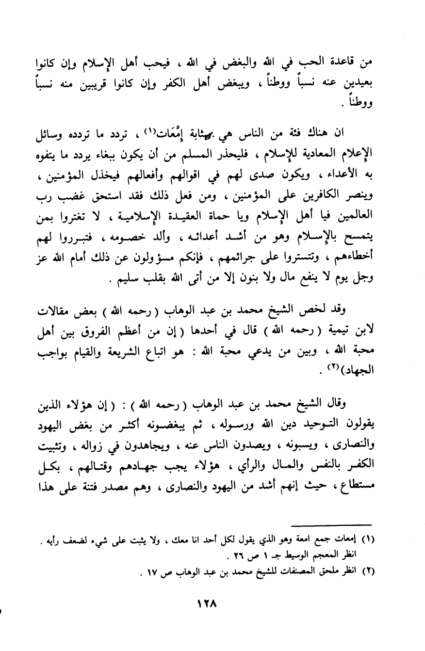 وقال الشيخ محمد بن عبد الوهاب رحمه الله: إن هؤلاء الذين يقولون التوحيد دين الله ورسوله، ثم يبغضونه أكثر من بغض اليهود والنصارى ويسبونه ويصدون الناس عنه، ويجاهدون في زواله وتثبيت الكفر بالنفس والمال والرأي، هؤلاء يجب جهادهم وقتالهم، بكل مستطاع حيث إنهم أشد من اليهود والنصارى، وهم مصدر فتنة على هذا