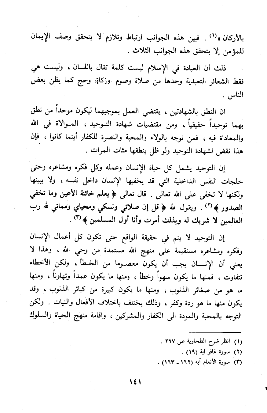 إن التوحيد لا يتم في حقيقة الواقع حتى تكون كل أعمال الإنسان وفكره ومشاعره مستقيمة على منهج الله مستمدة من وحي الله، وهذا يعني أن الإنسان يجب أن يكون معصوما من الخطأ ولكن الأخطاء تتفاوت فمنها ما يكون سهوا وخطأ ومنها ما يكون عمدًا وتهاونًا، ومنها ما هو من صغائر الذنوب، ومنها ما يكون كبيرًا من كبائر الذنوب، وقد يكون منها ما هو ردة وكفر، وذلك يختلف باختلاف الأفعال والنيات، ولكن التوجه بالمحبةوالمودة إلى الكفار والمشركين، وإقامة منهج الحياة والسلوك