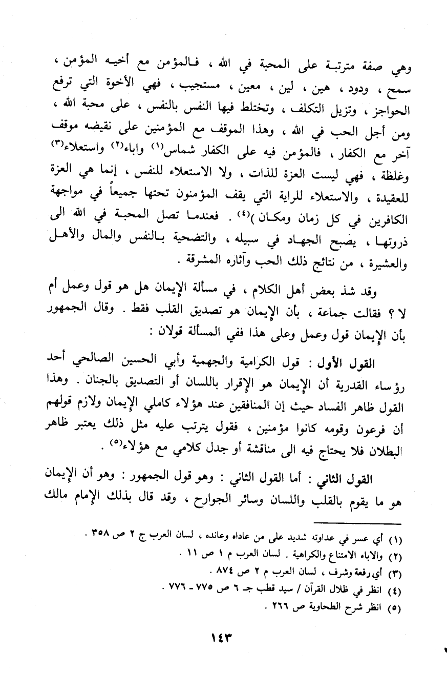 وقد شذ بعض أهل الكلام، في مسألة الإيمان هل هو قول وعمل أم لا؟ فقالت جماعة: بأن الإيمان هو تصديق القلب فقط، وقال الجمهور: بأن الإيمان قول وعمل وعلى هذا ففي المسألة قولان: