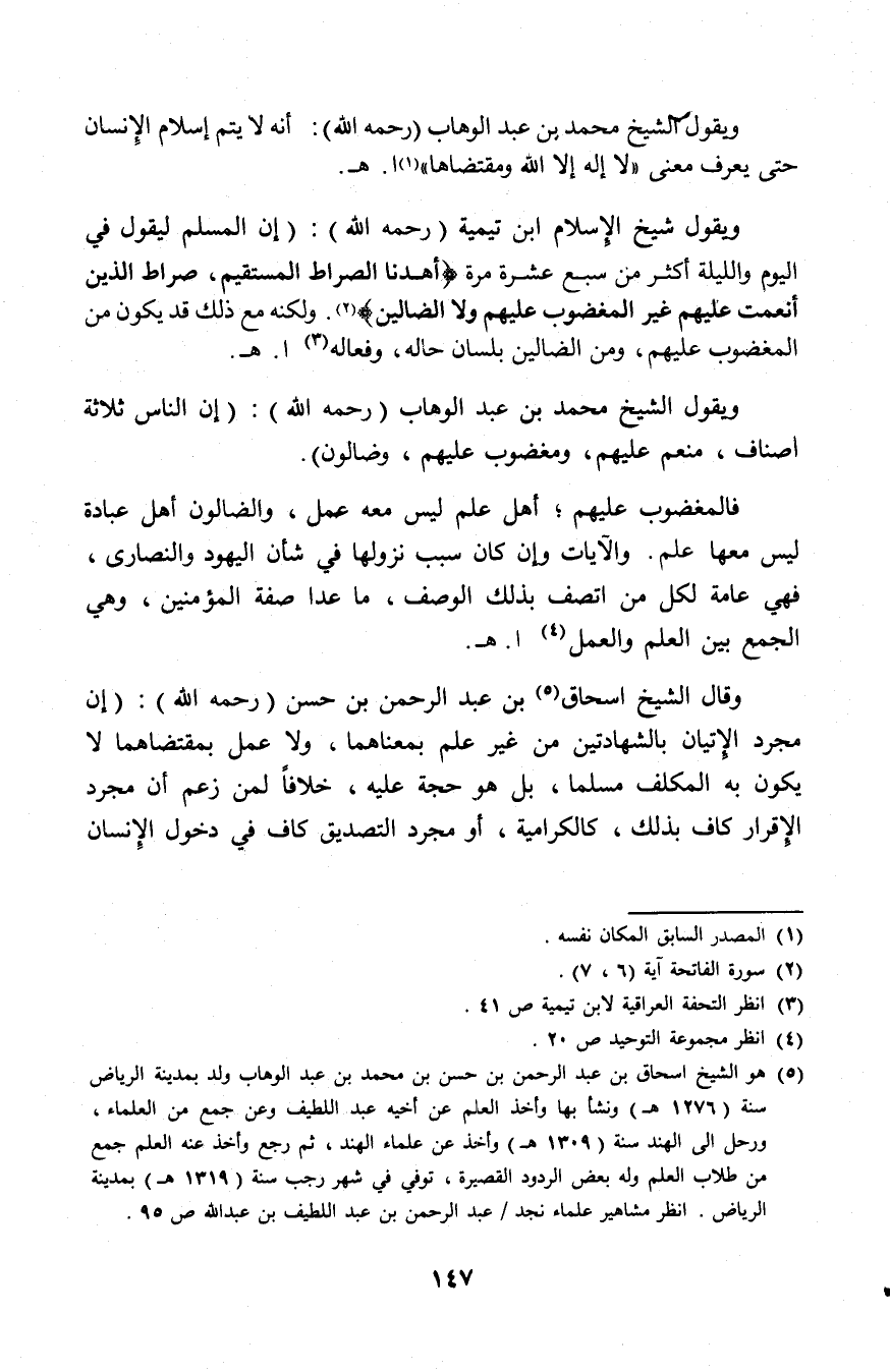 (¬4) هو الشيخ إسحاق بن عبد الرحمن بن حسن بن محمد بن عبد الوهاب ولد بمدينة الرياض (1276) ونشأ بها وأخذ العلم عن أخيه عبد اللطيف وعن جمع من العلماء ورحل إلى الهند سنة (1309) وأخذ عن علماء الهند ثم رجع وأخذ عنه العلم وجمع من طلاب العلم وله بعض الردود القصيرة توفي في شهر رجل سنة (1319) بمدينة الرياض انظر مشاهير علماء نجد عبد الرحمن بن عبد اللطيف بن عبد الله (95).