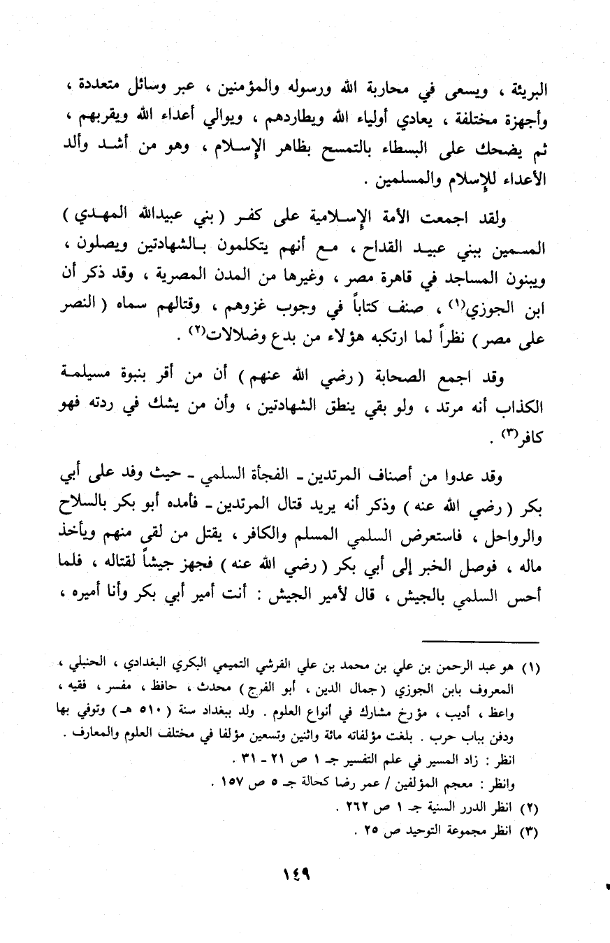 ولقد أجمعت الأمة الإسلامية على كفر (بني عبيد الله المهدي) المسمين ببني عبيد القداح، مع أنهم يتكلمون بالشهادتين ويصلون ويبنون المساجد في قاهرة مصر، وغيرها من المدن المصرية، وقد ذكر أن ابن الجوزي (¬1) صنف كتابا في وجوب غزوهم، وقتالهم سماه النصر على مصر نظرا لما ارتكبه هؤلاء من بدع وضلالات (¬2).