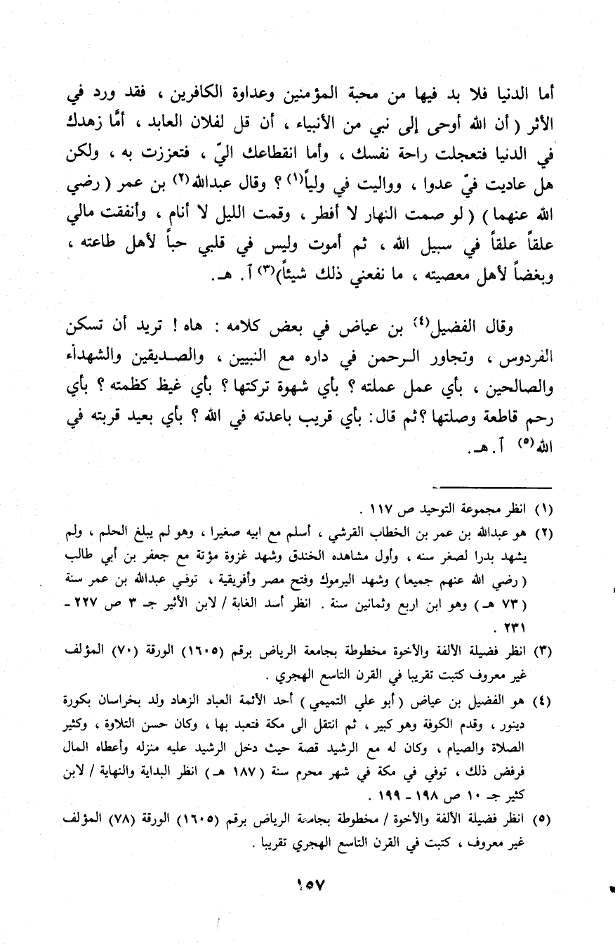 (¬4) هو الفضيل بن عياض أبو علي التميمي أحد الأئمة العباد الزهاد ولد بخراسان بكورة دينور، وقد الكوفة وهو كبير، ثم انتقل إلى مكة فتعبد بها، وكان حسن التلاوة وكثير الصلاة والصيام، وكان له مع الرشيد قصة حيث دخل الرشيد عليه منزلة وأعطاه المال فرفض ذلك، توفي في مكة في شهر محرم سنة (187 هـ) انظر البداية والنهاية لابن كثير (10/ 198، 199).