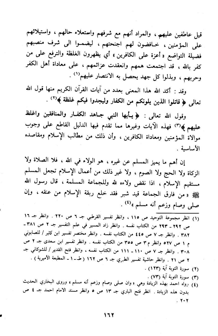 وقول الله تعالى: (يَا أَيُّهَا النَّبِيُّ جَاهِدِ الْكُفَّارَ وَالْمُنَافِقِينَ وَاغْلُظْ عَلَيْهِمْ) [التوبة: 73] فهذه الآيات وغيرها مما تقدم فيها الدليل القاطع على وجوب موالاة المؤمنين ومعاداة الكافرين، وأن ذلك من مطالب الإسلام ومقاصده الأساسية.