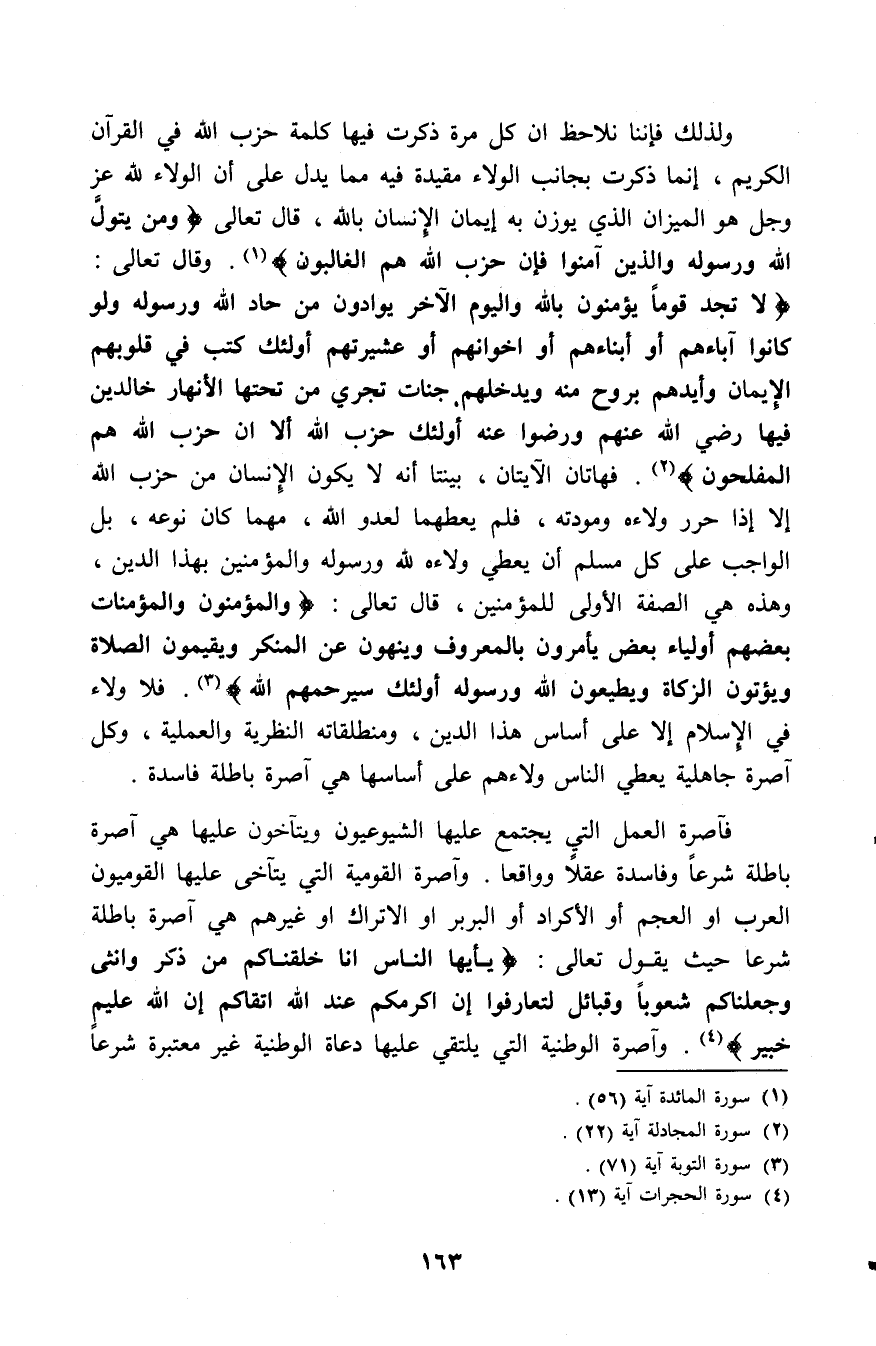 ولذلك فإننا نلاحظ أن كل مرة ذكرت فيما كلمة حزب الله في القرآن الكريم، إنما ذكرت بجانب الولاء مقيدة فيه مما يدل على أن الولاء لله عز وجل هو الميزان الذي يوزن به إيمان الإنسان بالله، قال تعالى: (وَمَنْ يَتَوَلَّ اللهَ وَرَسُولَهُ وَالَّذِينَ آمَنُوا فَإِنَّ حِزْبَ اللهِ هُمُ الْغَالِبُونَ) [المائدة: 56] وقال تعالى: (لا تَجِدُ قَوْمًا يُؤْمِنُونَ بِاللهِ وَالْيَوْمِ الآخِرِ يُوَادُّونَ مَنْ حَادَّ اللهَ وَرَسُولَهُ وَلَوْ كَانُوا آبَاءَهُمْ أَوْ أَبْنَاءَهُمْ أَوْ إِخْوَانَهُمْ أَوْ عَشِيرَتَهُمْ أُولَئِكَ كَتَبَ فِي قُلُوبِهِمُ الإِيمَانَ وَأَيَّدَهُمْ بِرُوحٍ مِنْهُ وَيُدْخِلُهُمْ جَنَّاتٍ تَجْرِي مِنْ تَحْتِهَا الأَنْهَارُ خَالِدِينَ فِيهَا رَضِيَ اللهُ عَنْهُمْ وَرَضُوا عَنْهُ أُولَئِكَ حِزْبُ اللهِ أَلا إِنَّ حِزْبَ اللهِ هُمُ الْمُفْلِحُونَ) [المجادلة: 22] فهاتان الآيتان، بينتا أنه لا يكون الإنسان من حزب الله إلا إذا حرر ولاءه ومودته فلم يعطهما لعدو الله، مهما كان نوعه، بل الواجب على كل مسلم أن يعطي ولاءه لله ورسوله والمؤمنين بهذا الدين وهذه هي الصفة الأولى للمؤمنين قال تعالى: (وَالْمُؤْمِنُونَ وَالْمُؤْمِنَاتُ بَعْضُهُمْ أَوْلِيَاءُ بَعْضٍ يَأْمُرُونَ بِالْمَعْرُوفِ وَيَنْهَوْنَ عَنِ الْمُنْكَرِ وَيُقِيمُونَ الصَّلاةَ وَيُؤْتُونَ الزَّكَاةَ وَيُطِيعُونَ اللهَ وَرَسُولَهُ أُولَئِكَ سَيَرْحَمُهُمُ اللهُ) [التوبة: 71] فلا ولاء في الإسلام إلا على أساس هذا الدين، ومنطلقاته النظرية والعملية، وكل آصرة جاهلية يعطي الناس ولاءهم على أساسها هي آصرة باطلة فاسدة.