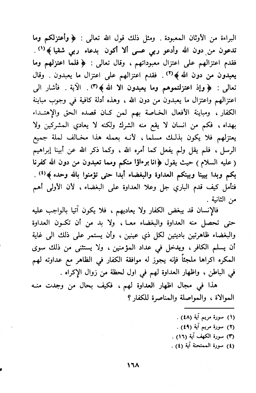 البراءة من الأوثان المعبودة، ومثل ذلك قول الله تعالى: (وَأَعْتَزِلُكُمْ وَمَا تَدْعُونَ مِنْ دُونِ اللهِ وَأَدْعُو رَبِّي عَسَى أَلا أَكُونَ بِدُعَاءِ رَبِّي شَقِيًّا) [مريم: 48] فقد اعتزالهم على اعتزال معبوداتهم وقال تعالى: (فَلَمَّا اعْتَزَلَهُمْ وَمَا يَعْبُدُونَ مِنْ دُونِ اللهِ) [مريم: 49] فقد اعتزالهم على اعتزال ما يعبدون وقال تعالى: (وَإِذِ اعْتَزَلْتُمُوهُمْ وَمَا يَعْبُدُونَ إِلا اللهَ) [الكهف: 16] الآية. فأشار إلى اعتزالهم واعتزال ما يعبدون من دون الله، وهذه أدلة كافية في وجوب مباينة الكفار، ومباينة الأفعال الخاصة بهم لمن كان قصده الحق والاهتداء بهداه، فكم من إنسان لا يقع منه الشرك ولكنه لا يعادي المشركين ولا يعتزلهم فلا يكون بذلك مسلما، لأنه بعمله هذا مخالف لملة جميع الرسل، فلم يقل ولم يفعل كما أمره الله، وكما ذكر الله عن أبينا إبراهيم عليه السلام حيث يقول: (إِنَّا بُرَآءُ مِنْكُمْ وَمِمَّا تَعْبُدُونَ مِنْ دُونِ اللهِ كَفَرْنَا بِكُمْ وَبَدَا بَيْنَنَا وَبَيْنَكُمُ الْعَدَاوَةُ وَالْبَغْضَاءُ أَبَدًا حَتَّى تُؤْمِنُوا بِاللهِ وَحْدَهُ) [الممتحنة: 4] فتأمل كيف قدم الباري جل وعلا العداوة على البغضاء، لأن الأولى أهم من الثانية.