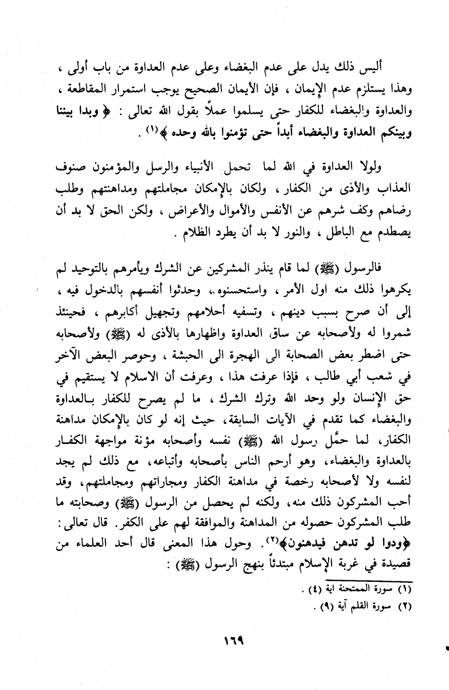 فالرسول - صلى الله عليه وسلم - لما قام ينذر المشركين عن الشرك ويأمرهم بالتوحيد لم يكرهوا ذلك منه أول الأمر، واستحسنوه، وحدثوا أنفسهم بالدخول فيه، إلى أن صرح بسب دينهم، وتسفيه أحلامهم وتجهيل أكابرهم، فحينئذ شمروا له ولأصحابه عن ساق العداوة وإظهارها بالأذى له - صلى الله عليه وسلم - ولأصحابه حتى اضطر بعض الصحابة إلى الهجرة إلى الحبشة، وحوصر البعض الآخر في شعب أبي طالب، فإذا عرفت هذا، وعرفت أن الإسلام لا يستقيم في حق الإنسان ولو وحد الله وترك الشرك، ما لم يصرح للكفار بالعداوة والبغضاء كما تقدم في الآيات السابقة، حيث إنه لو كان بالإمكان مداهنة الكفار، لما حمل رسول الله - صلى الله عليه وسلم - نفسه وأصحابه، مؤنة مواجهة الكفار بالعداوة والبغضاء وهو أرحم الناس بأصحابه وأتباعه، مع ذلك لم يجد لنفسه ولا لأصحابه رخصة في مداهنة الكفار ومجاراتهم ومجاملتهم، وقد أحب المشركون ذلك منه ولكنه لم يحصل من الرسول وصحابته ما طلب المشركون حصوله من المداهنة والموافقة لهم على الكفر، قال تعالى: (وَدُّوا لَوْ تُدْهِنُ فَيُدْهِنُونَ) [القلم: 9] وحول هذا المعنى قال أحد العلماء من قصيدة في غربة الإسلام مبتدئا بنهج الرسول - صلى الله عليه وسلم -.