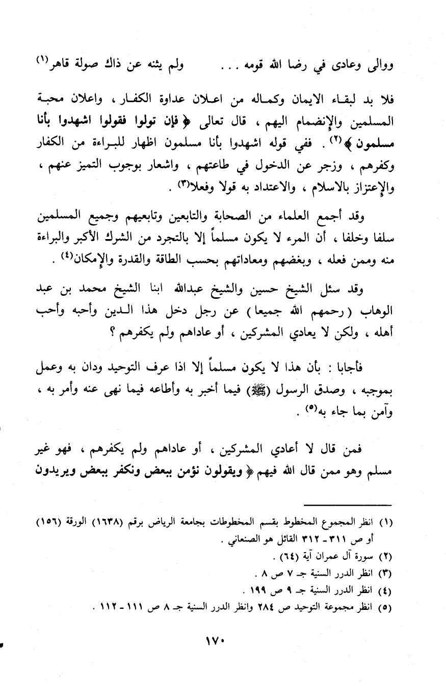 وقد سئل الشيخ حسين والشيخ عبد الله ابنا الشيخ محمد بن عبد الوهاب رحمهم الله جميعًا: عن رجل دخل هذا الدين وأحبه وأحب أهله، ولكن لا يعادي المشركين، أو عاداهم ولم يكفرهم.