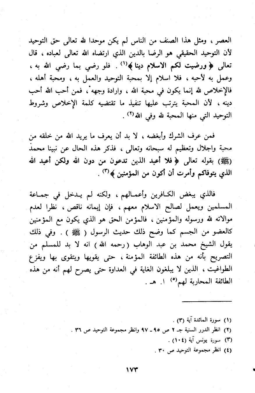 العصر ومثل هذا الصنف من الناس لم يكن موحدا لله تعالى حق التوحيد لأن التوحيد الحقيقي هو الرضا بالدين الذي ارتضاه الله تعالى لعباده قال تعالى: (وَرَضِيتُ لَكُمُ الإِسْلامَ دِينًا) [المائدة: 3] فلو رضي بما رضي الله به وعمل به لأحبه، فلا إسلام إلا بمحبة التوحيد والعمل به، ومحبة أهله، فالإخلاصة لله إنما يكون في محبة الله، وإرادة وجهه، فمن أحب الله أحب دينه، لأن المحبة يترتب عليها تنفيذ ما تقتضيه كلمة الإخلاص وشروط التوحيد التي منها المحبة لله وفي الله (¬1).