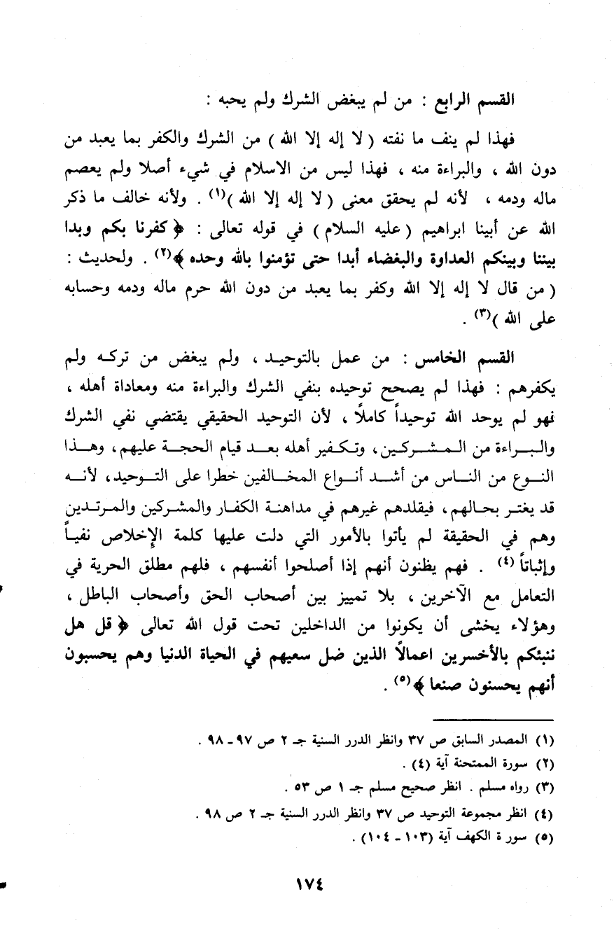 القسم الخامس: من عمل بالتوحيد، ولم يبغض من تركه ولم يكفرهم: فهذا لم يصحح توحيده بنفي الشرك والبراءة منه ومعاداة أهله، فهو لم يوحد الله توحيدا كاملا، لأن التوحيد الحقيقي يقتضي نفي الشرك والبراءة من المشركين وتكفير أهله بعد قيام الحجة عليهم وهذا النوع من الناس من أشد أنواع المخالفين خطرا على التوحيد لأنه قد يغتر بحالهم، فيقلدهم غيرهم في مداهنة الكفار والمشركين والمرتدين وهم في الحقيقة لم يأتوا بالأمور التي دلت عليه كلمة الإخلاص نفيا وإثباتا (¬3) فهم يظنون أنهم إذا أصلحوا أنفسهم فلهم مطلق الحرية في التعامل مع الآخرين، بلا تمييز بين أصحاب الحق وأصحاب الباطل وهؤلاء يخشى أن يكونوا من الداخلين تحت قول الله تعالى: (قُلْ هَلْ نُنَبِّئُكُمْ بِالأَخْسَرِينَ أَعْمَالاً * الَّذِينَ ضَلَّ سَعْيُهُمْ فِي الْحَيَاةِ الدُّنْيَا وَهُمْ يَحْسَبُونَ أَنَّهُمْ يُحْسِنُونَ صُنْعًا) [الكهف: 103، 104].
