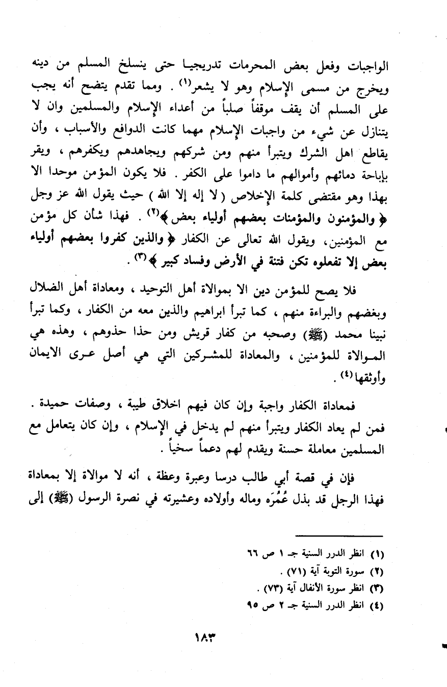 فلا يصح للمؤمن دين إلا بموالاة أهل التوحيد، ومعاداة أهل الضلال وبغضهم والبراءة منهم، كما تبرأ إبراهيم والذين معه من الكفار، وكما تبرأ نبينا محمد - صلى الله عليه وسلم - وصحبه من كفار قريش ومن حذا حذوهم، وهذه هي الموالاة للمؤمنين، والمعاداة للمشركين التي هي أصل عرى الإيمان وأوثقها (¬2).