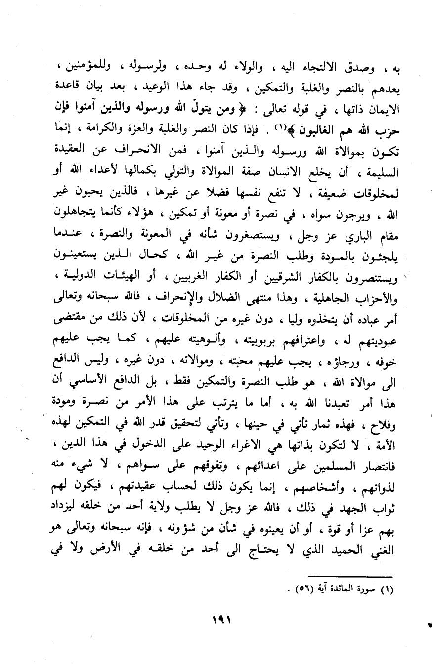 به، وصدق الالتجاء إليه، والولاء له وحده، ولرسوله وللمؤمنين يعدهم بالنصر والغلبة والتمكين، وقد جاء هذا الوعيد بعد بيان قاعدة الإيمان ذاتها في قوله تعالى: (وَمَنْ يَتَوَلَّ اللهَ وَرَسُولَهُ وَالَّذِينَ آمَنُوا فَإِنَّ حِزْبَ اللهِ هُمُ الْغَالِبُونَ) [المائدة: 56] فإذا كان النصر والغلبة والعزة والكرامة إنما تكون بموالاة الله ورسوله والذين آمنوا فمن الانحراف عن العقيدة السلمية أن يخلع الإنسان صفة الموالاة والتولي بكمالها لأعداء الله أو لمخلقوات ضعيفة، لا تنفع نفسها فضلا عن غيرها، فالذين يحبون غير الله، ويرجون سواه، في نصرة أو معونة أو تمكين، هؤلاء كأنما يتجاهلون مقام الباري عز وجل، ويتصغرون شأنه في المعونة والنصرة، عندما يلجئون بالمودة وطلب النصرة من غير الله، كحال الذين يستعينون ويستنصرون بالكفار الشرقيين أو الكفار الغربيين أو الهيئات الدولية، والأحزاب الجاهلية، وهذا منتهى الضلال والانحراف، فالله سبحانه وتعالى أمر عباده أن يتخذوه وليا، دون غيره من المخلوقات؛ لأن ذلك من مقتضى عبوديتهم له، واعترافهم بربوبيته، وألوهيته عليهم، كما يجب عليهم خوفه، ورجاؤه، يجب عليهم محبته، وموالاته دون غيره، وليس الدافع إلى موالاة الله، هو طلب النصرة والتمكين فقط، بل الدافع الأساسي أن هذا أمر تعبدنا الله به، أما ما يترتب على هذا الأمر من نصرة ومودة وفلاح، فهذه ثمار تأتي في حينها، وتأتي لتحقيق قدر الله في التمكين لهذه الأمة، لا لتكون بذاتها هي الأغراء الوحيد على الدخول في هذا الدين فانتصار المسلمين على أعدائهم، وتفوقهم على سواهم، لا شيء منه لذواتهم، وأشخاصهم إنما يكون ذلك لحساب عقيدتهم، فيكون لهم ثواب الجهد في ذلك، فالله عز وجل لا يطلب ولاية أحد من خلقه ليزداد بهم عزا أو قوة، أو أن يعينوه في شأن من شئونه فإنه سبحانه وتعالى هو الغني الحميد الذي لا يحتاج إلى أحد من خلقه في الأرض ولا في