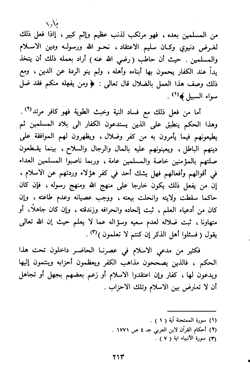 من المسلمين بعده، فهو مرتكب لذنب عظيم وإثم كبير، إذا فعل ذلك لغرض دنيوي وكان سليم الاعتقاد، نحو الله ورسوله ودين الإسلام والمسلمين حيث إن حاطب رضي الله عنه أراد بعمله ذلك أن يتخذ يدا عند الكفار يحمون بها أبناءه وأهله، ولو ينو الردة عن الدين ومع ذلك وصف هذا العمل بالضلال قال تعالى: (وَمَنْ يَفْعَلْهُ مِنْكُمْ فَقَدْ ضَلَّ سَوَاءَ السَّبِيلِ) [االممتحنة: 1].