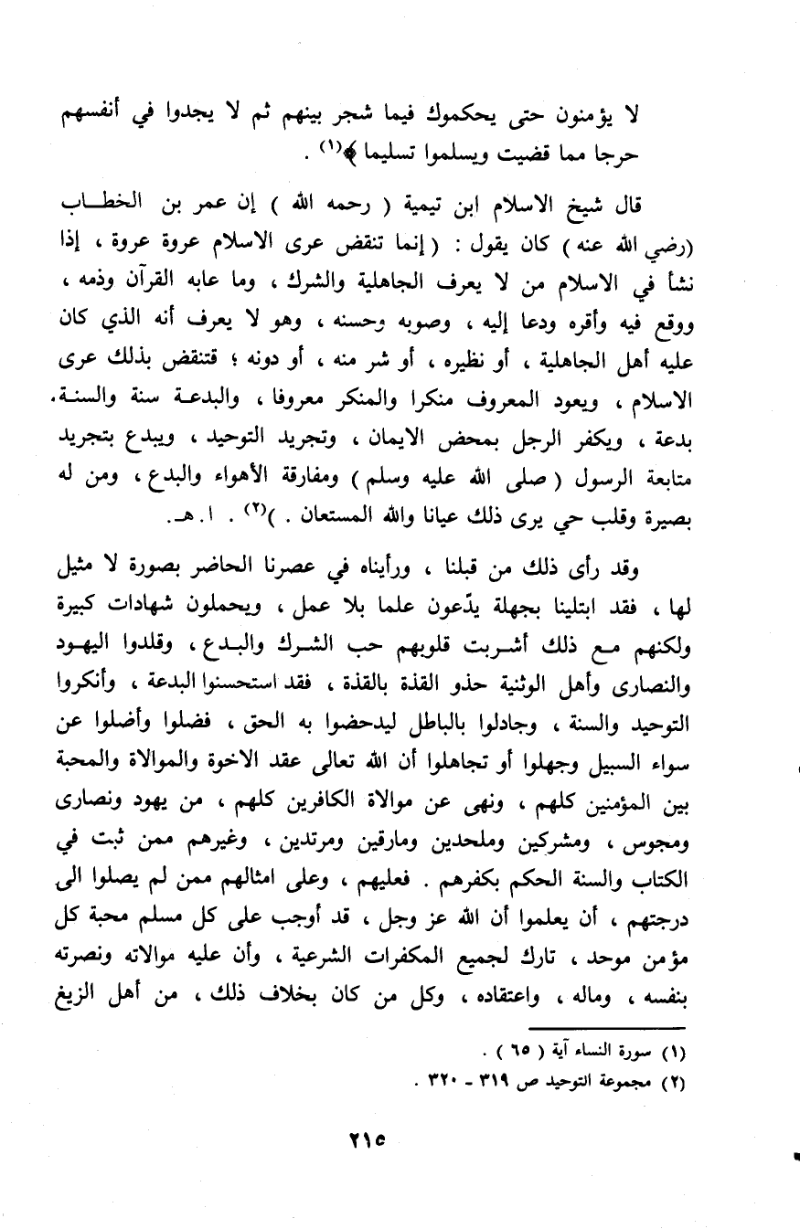 قال شيخ الإسلام ابن تيمية رحمه الله: إن عمر بن الخطاب رضي الله عنه كان يقول: إنما تنقض عرى الإسلام عروة عروة، إذا نشأ في الإسلام من لا يعرف الجاهلية والشرك، وما عابه القرآن وذمة ووقع فيه وأقره ودعا إليه، وصوبه وحسنه، وهو لا يعرف أنه الذي كان عليه أهل الجاهلية، أو نظيره أو شر منه، أو دونه فتنقض بذلك عرى الإسلام ويعود المعروف منكرا والمنكر معروفا، والبدعة سنة والسنة بدعة، ويكفر الرجل بمحض الإيمان وتجريد التوحيد، ويبدع بتجريد متابعة الرسول - صلى الله عليه وسلم - ومفارقة الأهواء والبدع، ومن له بصيرة وقلب حي يرى ذلك عيانا والله المستعان (¬1) اهـ.