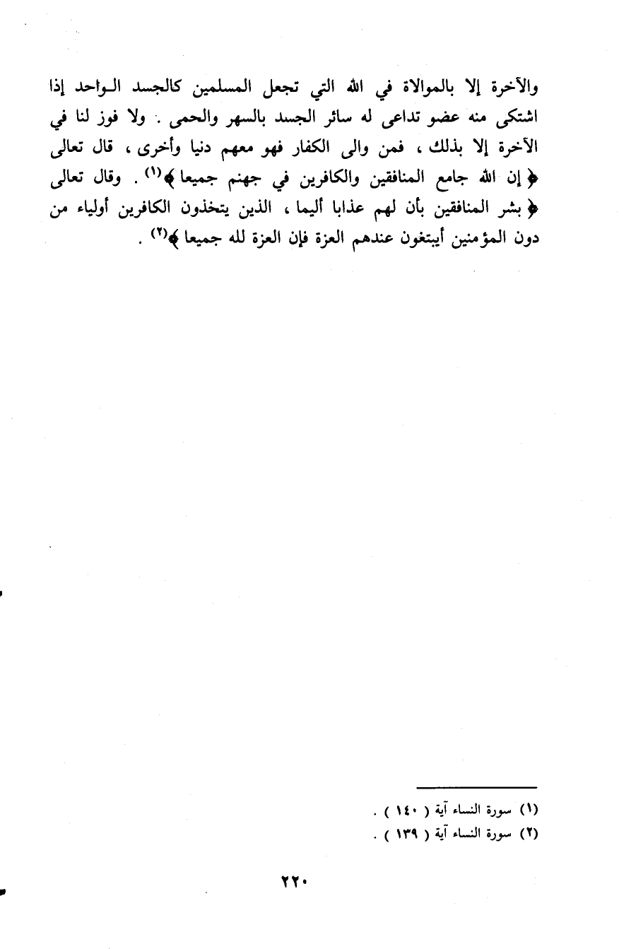 والآخرة إلا بالموالاة في الله التي تجعل المسلمين كالجسد الواحد إذا اشتكى منه عضو تداعى له سائر الجسد بالسهر والحمى، ولا فوز لنا في الآخرة إلا بذلك، فمن والى الكفار فهو معهم دنيا وأخرى، قال تعالى: (إِنَّ اللهَ جَامِعُ الْمُنَافِقِينَ وَالْكَافِرِينَ فِي جَهَنَّمَ جَمِيعًا) [النساء: 140]، وقال تعالى: (بَشِّرِ الْمُنَافِقِينَ بِأَنَّ لَهُمْ عَذَابًا أَلِيمًا * الَّذِينَ يَتَّخِذُونَ الْكَافِرِينَ أَوْلِيَاءَ مِنْ دُونِ الْمُؤْمِنِينَ أَيَبْتَغُونَ عِنْدَهُمُ الْعِزَّةَ فَإِنَّ الْعِزَّةَ للهِ جَمِيعًا) [النساء: 139].