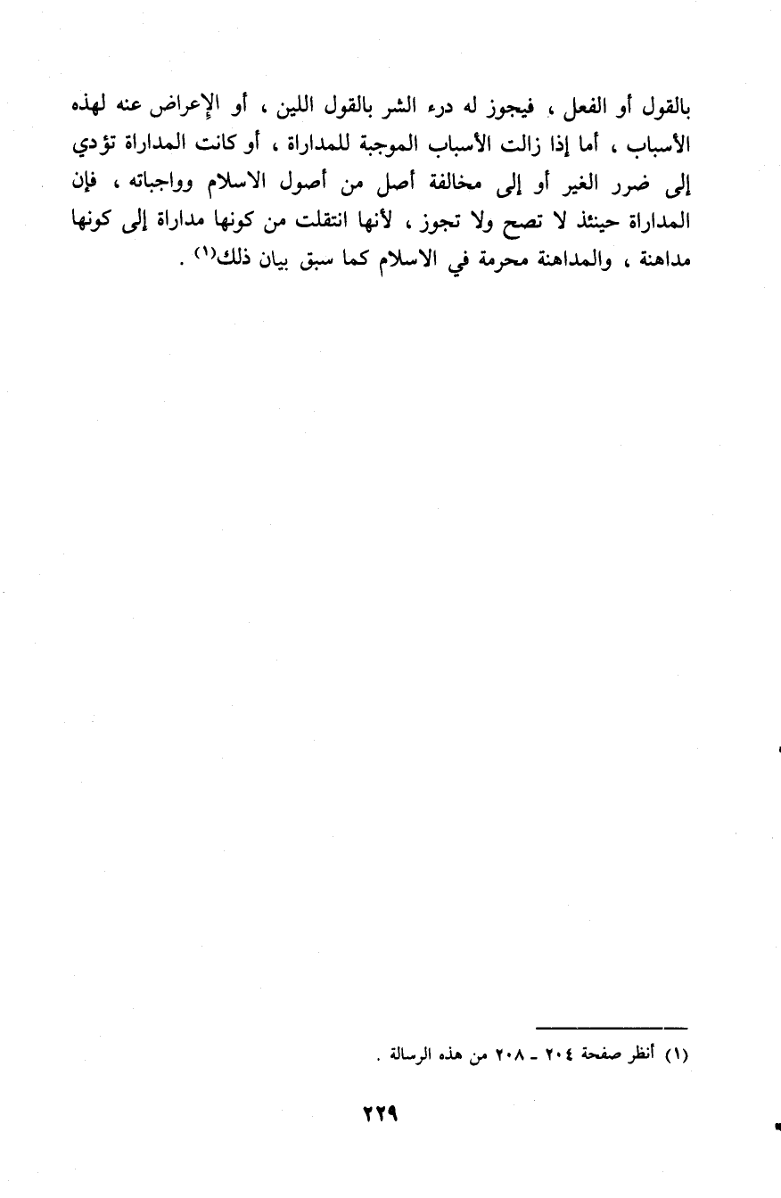 بالقول أو الفعل، فيجوز له درء الشر بالقول اللين، أو الإعراض عنه لهذه الأسباب، أما إذا زالت الأسباب الموجبة للمداراة، أو كانت المداراة تؤدي إلى ضرر الغير أو إلى مخالفة أصل من أصول الإسلام وواجباته فإن المداراة حينئذ لا تصح ولا تجوز، لأنها انتقلت من كونها مداراة إلى كونها مداهنة، والمداهنة محرمة في الإسلام كما سبق بيان ذلك (¬1).