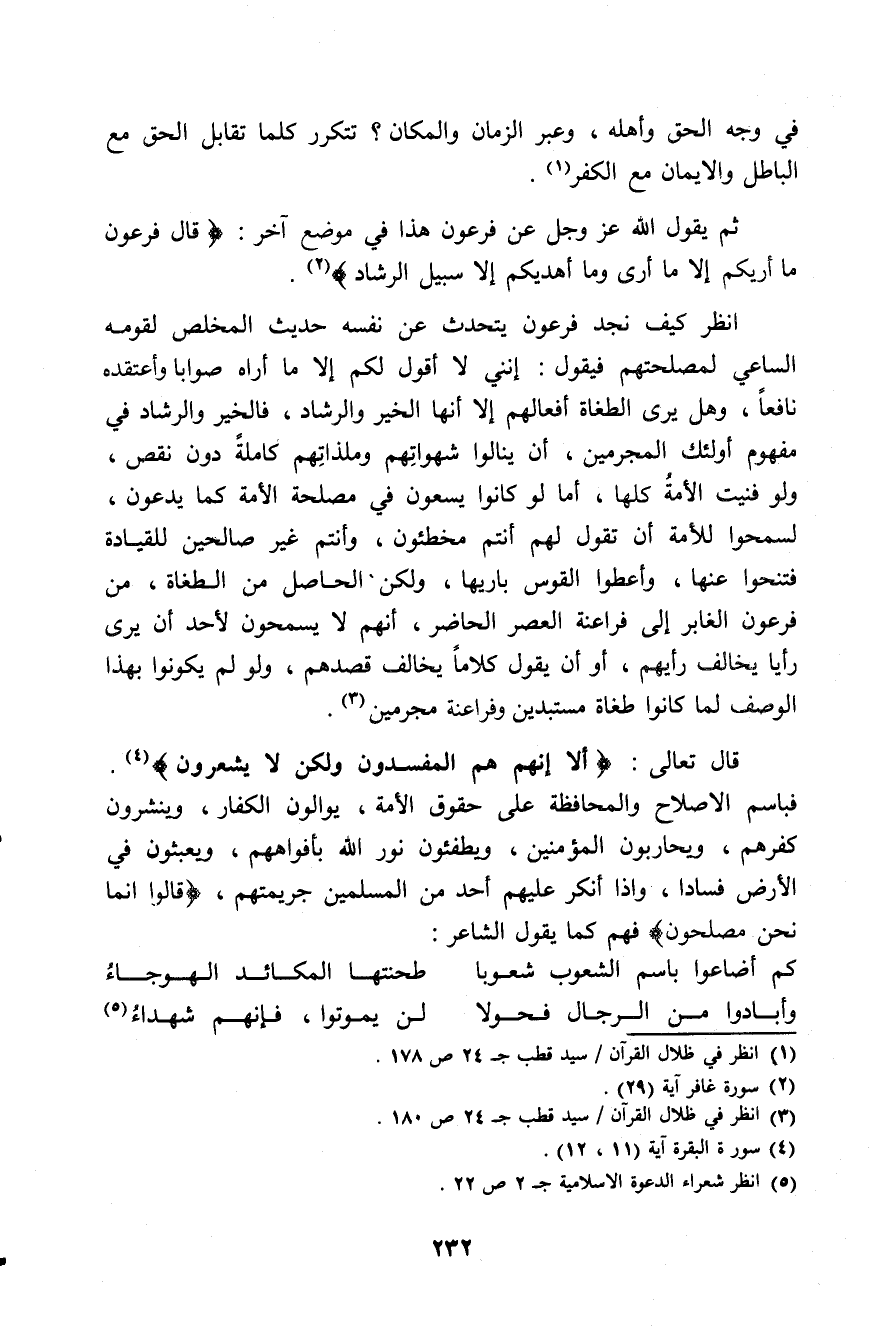 انظر كيف نجد فرعون يتحدث عن نفسه حديث المخلص لقومه الساعي لمصلحتهم فيقول: إنني لا أقول لكم إلا ما أراه صوابًا وأعتقده نافعًا، وهل يرى الطغاة أفعالهم إلا أنها الخير والرشاد؟ فالخير والرشاد في مفهوم أولئك المجرمين، أن ينالوا شهواتهم وملذاتهم كاملة دون نقص، ولو فنيت الأمة كلها، أما لو كانوا يسعون في مصلحة الأمة كما يدعون، لسمحوا للأمة أن تقول لهم أنتم مخطئون، وأنتم غير صالحين للقيادة فتنحوا عنها، وأعطوا القوس باريها ولكن الحاصل من الطغاة من فرعون الغابر إلى فراعنة العصر الحاضر، أنهم لا يسمحون لأحد أن يرى رأيا يخالف رأيهم، أو أن يقول كلاما يخالف قصدهم، ولو لم يكونوا بهذا الوصف لما كانوا طغاة مستبدين وفراعنة مجرمين (¬2).