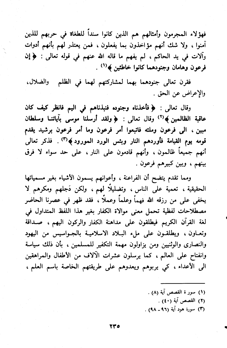 وقال تعالى: (فَأَخَذْنَاهُ وَجُنُودَهُ فَنَبَذْنَاهُمْ فِي الْيَمِّ فَانْظُرْ كَيْفَ كَانَ عَاقِبَةُ الظَّالِمِينَ) [القصص: 40] وقال تعالى: (وَلَقَدْ أَرْسَلْنَا مُوسَى بِآيَاتِنَا وَسُلْطَانٍ مُبِينٍ * إِلَى فِرْعَوْنَ وَمَلَئِهِ فَاتَّبَعُوا أَمْرَ فِرْعَوْنَ وَمَا أَمْرُ فِرْعَوْنَ بِرَشِيدٍ * يَقْدُمُ قَوْمَهُ يَوْمَ الْقِيَامَةِ فَأَوْرَدَهُمُ النَّارَ وَبِئْسَ الْوِرْدُ الْمَوْرُودُ) [هود: 96 - 98] فذكر تعالى أنهم جميعا ظالمون، وأنهم قادمون على النار، على حد سواء لا فرق بينهم وبين كبيرهم فرعون.