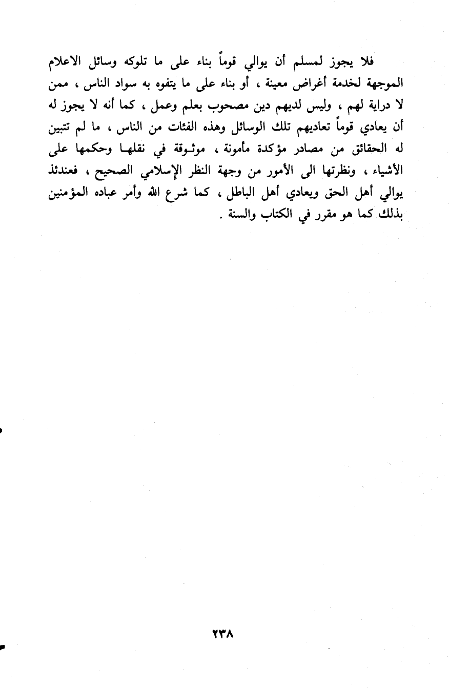 فلا يجوز لمسلم أن يوالي قوما بناء على ما تلوكه وسائل الأعلام الموجهة لخدمة أغراض معينة، أو بناء على ما يتفوه به سواد الناس ممن لا دراية لهم، وليس لديهم دين مصحوب بعلم وعمل، كما أنه لا يجوز له أن يعادي قوما تعاديهم تلك الوسائل وهذه الفئات من الناس، ما لم تتبين له الحقائق من مصادر مؤكدة مأمونة موثوقة في نقلها وحكمها على الأشياء، ونظرتها إلى الأمور من وجهة النظر الإسلامي الصحيح، فعندئذ يوالي أهل الحق ويعادي أهل الباطل، كما شرع الله وأمر عباده المؤمنين بذلك كما هو مقرر في الكتاب والسنة.