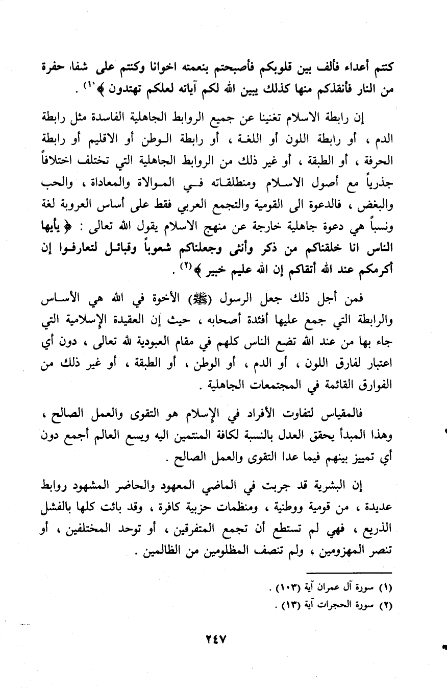 إن رابطة الإسلام تغنينا عن جميع الروابط الجاهلية الفاسدة مثل رابطة الدم، أو رابطة اللون أو اللغة، أو رابطة الوطن أو الإقليم أو رابطة الحرفة أو الطبقة، أو غير ذلك من الروابط الجاهلية التي تختلف اختلاف جذريا مع أصول الإسلام ومنطلقاته في الموالاة والمعاداة، والحب والبغض فالدعوة إلى القومية والتجمع العربي فقط على أساس العروبة لغةً ونسبًا هي دعوة جاهلية خارجة عن منهج الإسلام يقول الله تعالى: (يَا أَيُّهَا النَّاسُ إِنَّا خَلَقْنَاكُمْ مِنْ ذَكَرٍ وَأُنْثَى وَجَعَلْنَاكُمْ شُعُوبًا وَقَبَائِلَ لِتَعَارَفُوا إِنَّ أَكْرَمَكُمْ عِنْدَ اللهِ أَتْقَاكُمْ إِنَّ اللهَ عَلِيمٌ خَبِيرٌ) [الحجرات: 13].