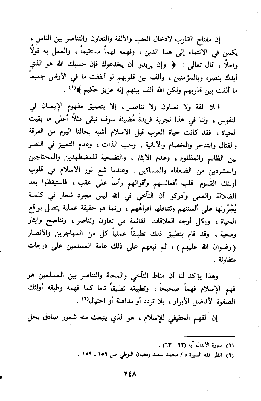 وهذا يؤكد لنا أن مناط التآخي والمحبة والتناصر بين المسلمين هو فهم الإسلام فهما صحيحا، وتطبيقه تطبيقا تاما كما فهمه وطبقه أولئك الصفوة الأفاضل الأبرار، بلا تردد أو مداهنة أو احتيال (¬1).