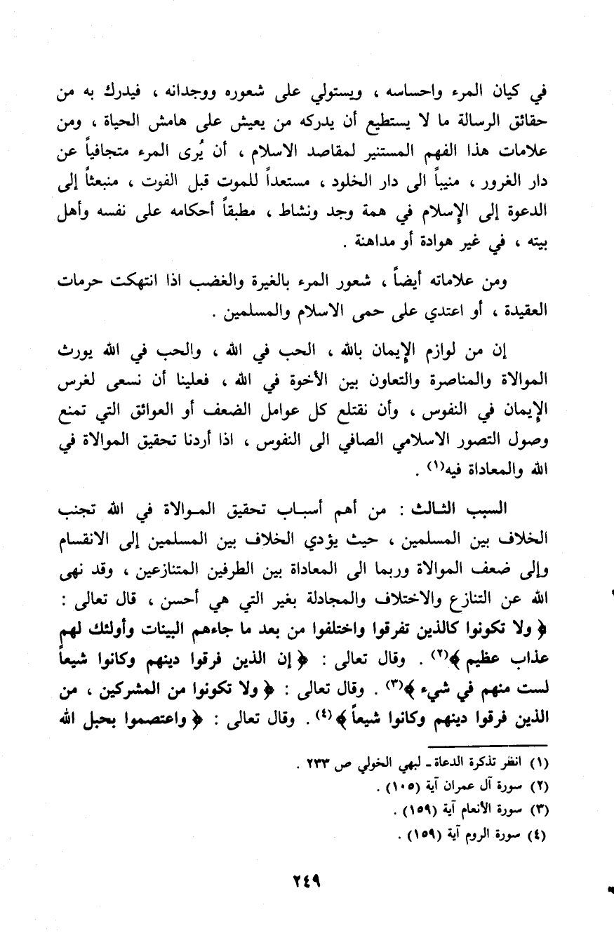إن من لوازم الإيمان بالله، الحب في الله، والحب في الله يورث الموالاة والمناصرة والتعاون بين الإخوة في الله، فعلينا أن نسعى لغرس الإيمان في النفوس وأن نقتلع كل عوامل الضعف أو العوائق التي تمنع وصول التصور الإسلامي الصافي إلى النفوس، إذا أردنا تحقيق الموالاة في الله والمعاداة فيه (¬1).