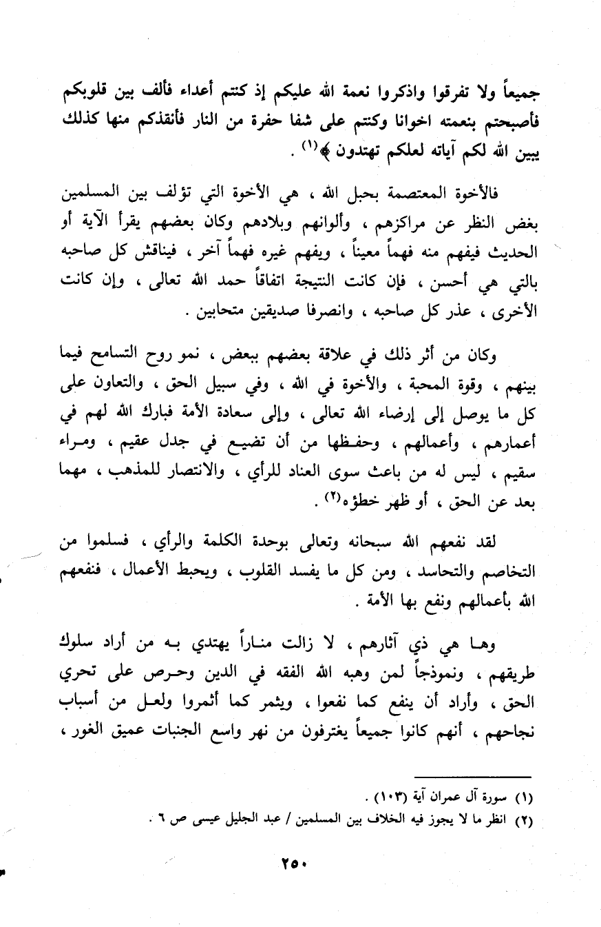 وَلا تَفَرَّقُوا وَاذْكُرُوا نِعْمَةَ اللهِ عَلَيْكُمْ إِذْ كُنْتُمْ أَعْدَاءً فَأَلَّفَ بَيْنَ قُلُوبِكُمْ فَأَصْبَحْتُمْ بِنِعْمَتِهِ إِخْوَانًا وَكُنْتُمْ عَلَى شَفَا حُفْرَةٍ مِنَ النَّارِ فَأَنْقَذَكُمْ مِنْهَا كَذَلِكَ يُبَيِّنُ اللهُ لَكُمْ آيَاتِهِ لَعَلَّكُمْ تَهْتَدُونَ) [آل عمران: 103].