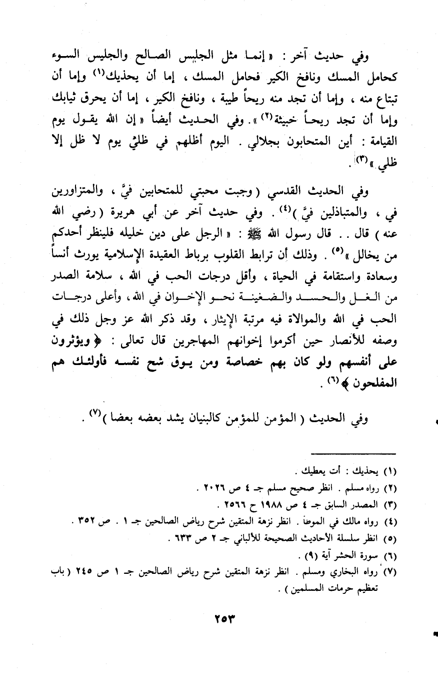 وفي حديث آخر: «إنما مثل الجليس الصالح والجليس السوء كحامل المسك ونافخ الكير فحامل المسك، إما أن يحذيك (¬1) وإما أن تبتاع منه، وإما أن تجد منه ريحا طيبة، ونافخ الكير، إما أن يحرق ثيابك وإما أن تجد ريحا خبيثة» (¬2)، وفي الحديث أيضًا: «إن الله يقول يوم القيامة: أين المتحابون بجلالي، اليوم أظلهم في ظلي يوم لا ظل إلا ظلي» (¬3).