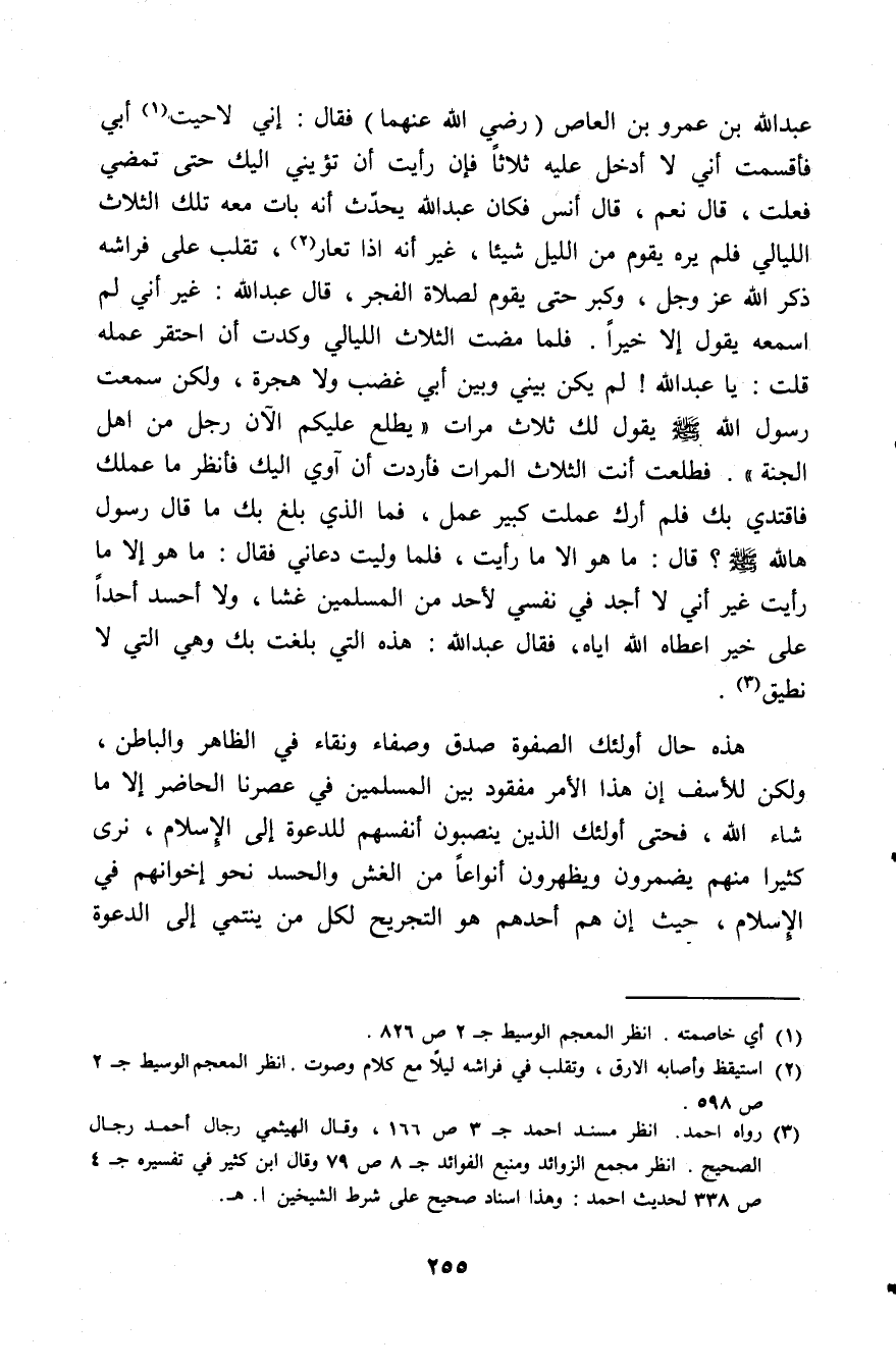 عبد الله بن عمرو بن العاص رضي الله عنهما فقال: إني لاحيت (¬1) أبي فأقسمت أني لا أدخل عليه ثلاثا فإن رأيت أن تؤيني إليك حتى تمضي فعلت، قال: نعم، قال: أنس فكان عبد الله يحدث أنه بات معه تلك الثلاث الليالي فلم يره يقوم من الليل شيئًا، غير أنه إذا تعار (¬2) تقلب على فراشه ذكر الله عز وجل، وكبر حتى يقوم لصلاة الفجر، قال عبد الله: غير أني لم أسمعه يقول إلا خيرا، فلما مضت الثلاث ليالي وكدت أن أحتقر عمله قلت: يا عبد الله لم يكن بيني وبين أبي غضب ولا هجرة، ولكن سمعت رسول الله - صلى الله عليه وسلم - يقول لك ثلاث مرات: «يطلع عليكم الآن رجل من أهل الجنة» فطلعت أنت الثلاث المرات فأردت أن آوي إليك فأنظر ما عملك فاقتدي بك فلم أرك عملت كبير عمل، فما الذي بلغ بك ما قال رسول الله - صلى الله عليه وسلم -؟ قال: ما هو إلا ما رأيت، فلما وليت دعاني، فقال: ما هو إلا ما رأيت غير أني لا أجد في نفسي لأحد من المسلمين غشا، ولا أحسد أحدا على خير أعطاه الله إياه، فقال عبد الله: هذه التي بلغت بك وهي التي لا نطيق (¬3).