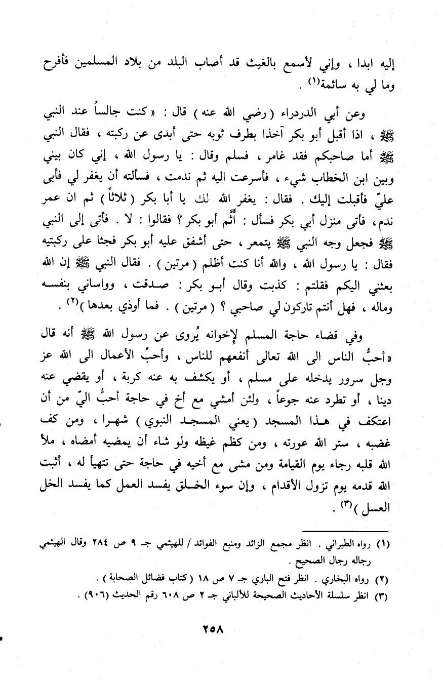 وفي قضاء حاجة المسلم لإخوانه يروى عن رسول الله - صلى الله عليه وسلم - أنه قال: «أحب الناس إلى الله تعالى أنفعهم للناس، وأحب الأعمال إلى الله عز وجل سرور يدخله على مسلم، أو يكشف به عنه كربةً أو يقضي عنه دينا، أو تطرد عنه جوعا، ولئن أمشي مع أخ في حاجة أحب إليَّ من أن اعتكف في هذا المسجد (يعني: المسجد النبوي) شهرًا ومن كفَّ غضبه ستر الله عورته، ومن كظم غيظه ولو شاء أن يمضيه أمضاه، ملأ الله قلبه رجاء يوم القيامة ومن مشى مع أخيه في حاجة حتى تتهيأ له، أثبت الله قدمه يوم تزول الأقدام، وإن سوء الخلق يفسد العمل كما يفسد الخل العسل» (¬3).