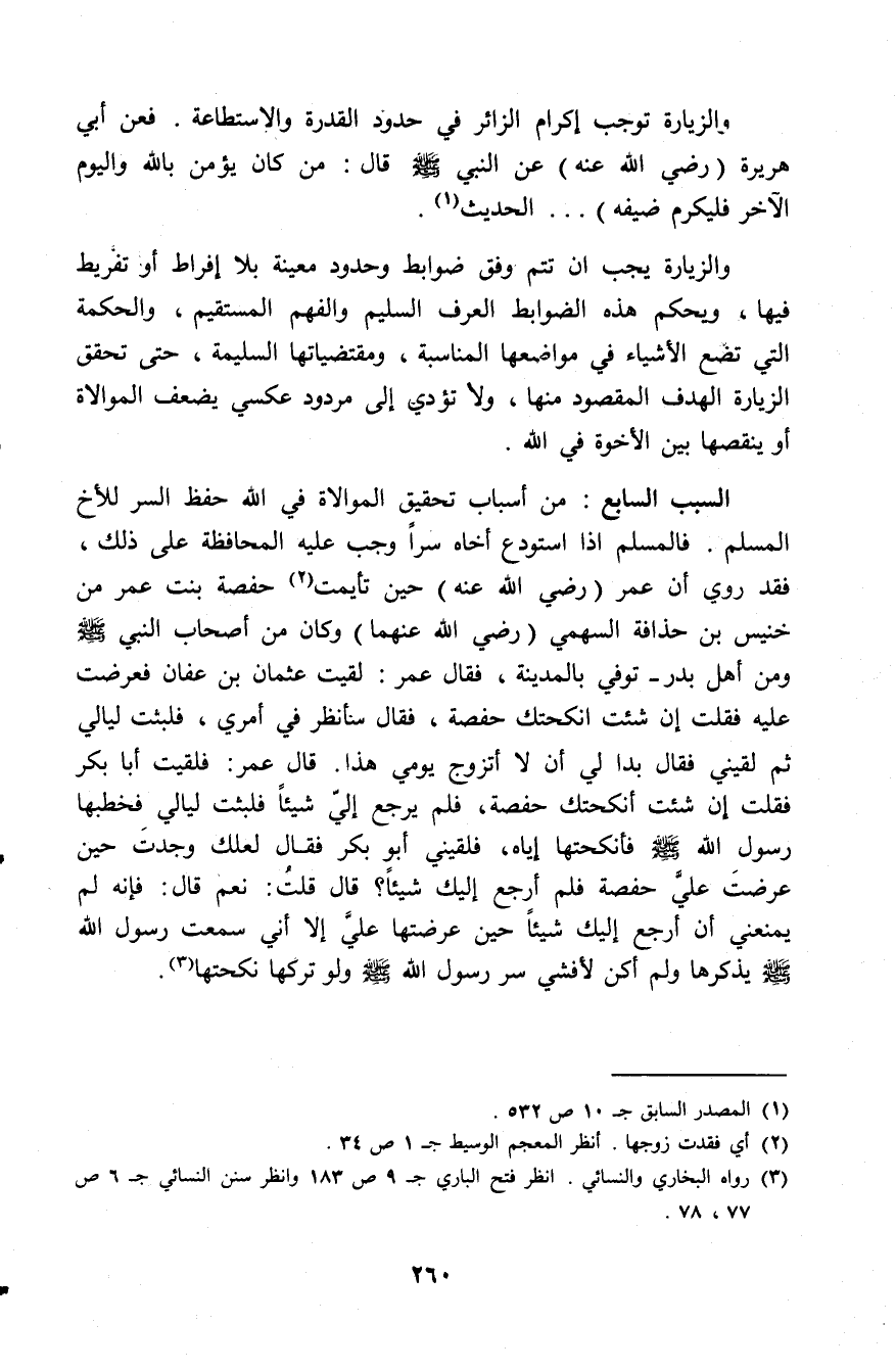 السبب السابع: من أسباب تحقيق الموالاة في الله حفظ السر للأخ المسلم، فالمسلم إذا استودع أخاه سرًّا وجب عليه المحافظة على ذلك، فقد روي أن عمر رضي الله عنه حين تأيمت (¬2) حفصة بنت عمر من خنيس بن حذافة السهمي رضي الله عنهما وكان من أصحاب النبي - صلى الله عليه وسلم - ومن أهل بدر توفي بالمدينة، فقال عمر: لقيت عثمان بن عفان فعرضت عليه فقلت إن شئت أنكحتك حفصة، فقال سأنظر في أمري، فلبثت ليالي ثم لقيني فقال بدا لي أن لا أتزوج يومي هذا، قال عمر: فلقيت أبا بكر فقلت إن شئت أنكحتك حفصة، فلم يرجع إلى شيئا فلبثت ليالي فخطبها رسول الله - صلى الله عليه وسلم - فأنكحتها إياه، فلقيني أبو بكر فقال: لعلك وجدت حين عرضت عليَّ حفصة فلم أرجع إليك شيئا؟ قال قلت: نعم قال: فإنه لم يمنعني أن أرجع إليك شيئًا حين عرضتها علي إلا أني سمعت رسول الله - صلى الله عليه وسلم - يذكرها ولم أكن لأفشي سر رسول الله - صلى الله عليه وسلم - ولو تركها نكحتها (¬3).