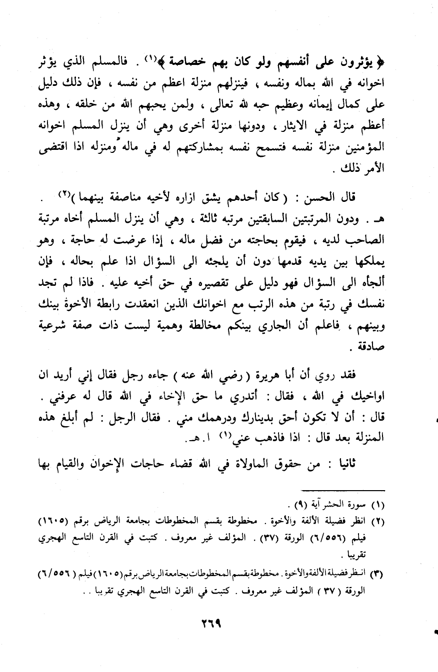 (¬2) انظر فضيلة الألفة والأخوة، مخطوط بقسم المخطوطات بجامعة الرياض برقم (1605) فيلم (556/ 6) الورقة (37) المؤلف غير معروف، كتبت في القرن التاسع الهجري تقريبا.