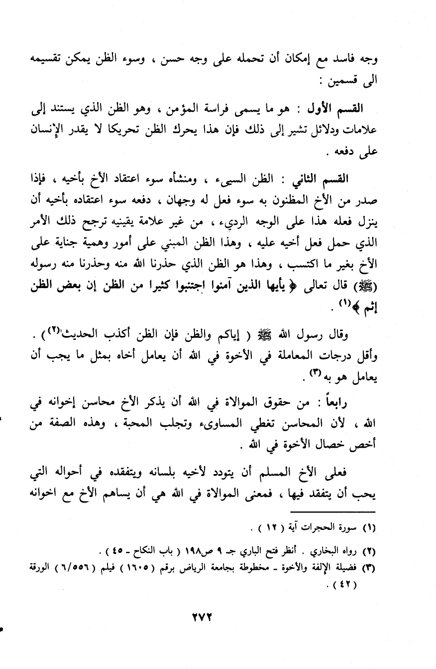 وقال رسول الله - صلى الله عليه وسلم - «إياكم والظن فإن الظن أكذب الحديث (¬1)» وأقل درجات المعاملة في الأخوة في الله أن يعامل أخاه بمثل ما يجب أن يعامل هو به (¬2).