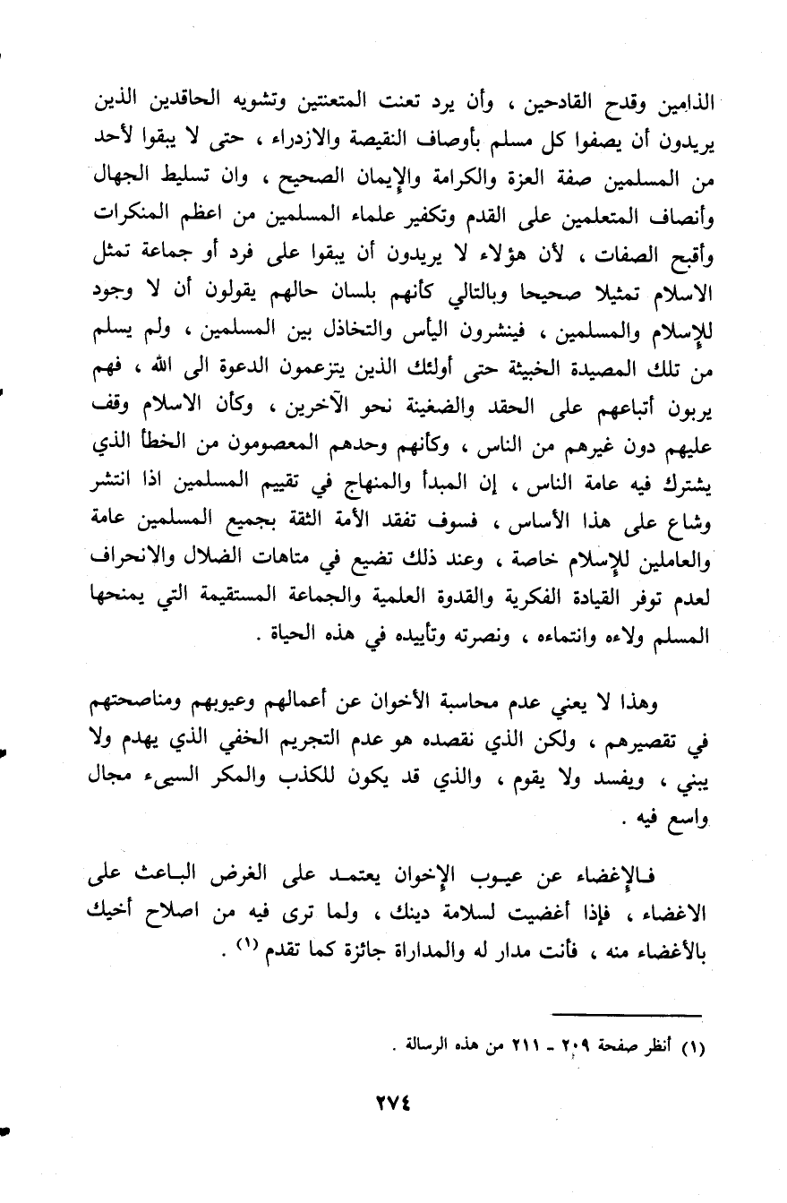الذامين وقدح القادحين، وأن يرد تعنت المتعنتين وتشويه الحاقدين الذين يريدون أن يصفوا كل مسلم بأوصاف النقيصة والازدراء حتى لا يبقوا لأحد من المسلمين صفة العزة والكرامة والإيمان الصحيح، وإن تسليط الجهال وأنصاف المتعلمين على القدم وتكفير علماء المسلمين من أعظم المنكرات وأقبح الصفات، لأن هؤلاء لا يريدون أن يبقوا على فرد أو جماعة تمثل الإسلام تمثيلا صحيحا وبالتالي كأنهم بلسان حالهم يقولون أن لا وجود للإسلام والمسلمين فينشرون اليأس والتخاذل بين المسلمين، ولم يسلم من تلك المصيدة الخبيثة حتى أولئك الذين يتزعمون الدعوة إلى الله، فهم يربون أتباعهم على الحقد والضغينة نحو الآخرين، وكأن الإسلام وقف عليهم دون غيرهم من الناس، وكأنهم وحدهم المعصومون من الخطأ الذي يشترك فيه عامة الناس، إن المبدأ والمنهاج في تقييم المسلمين إذا انتشر وشاع على هذا الأساس، فسوف تفقد الأمة الثقة بجميع المسلمين عامة والعاملين للإسلام خاصة، وعند ذلك تضيع في متاهات الضلال والانحراف لعدم توفر القيادة الفكرية والقدوة العلمية والجماعة المستقيمة التي يمنحها المسلم ولاءه وانتماءه ونصرته وتأييده في هذه الحياة.