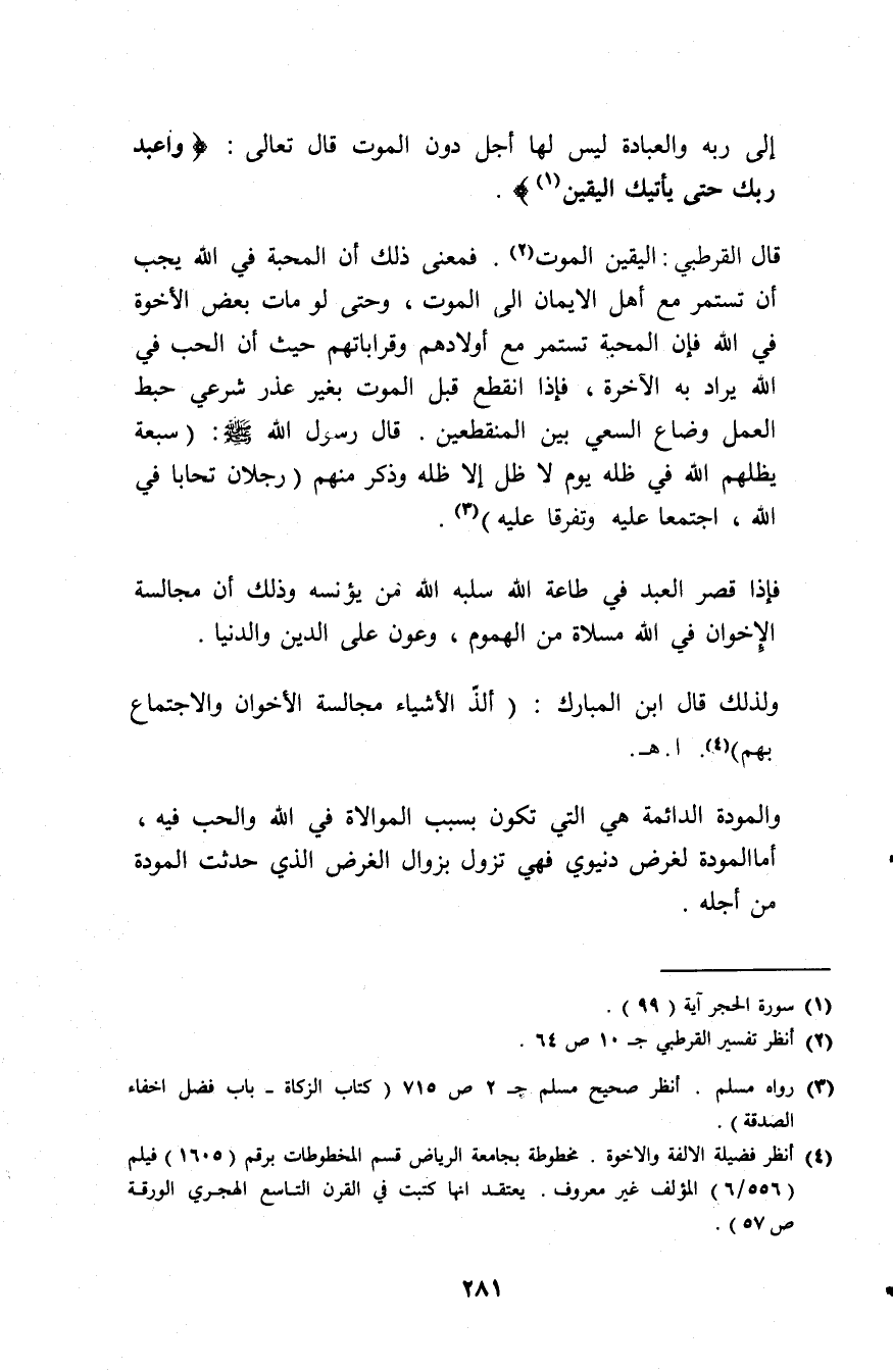 قال القرطبي: اليقين الموت (¬1) فمعنى ذلك أن المحبة في الله يجب أن تستمر مع أهل الإيمان إلى الموت، وحتى ولو مات بعض الإخوة في الله فإن المحبة تستمر مع أولادهم وقراباتهم حيث إن الحب في الله يراد به الآخرة فإذا انقطع قبل الموت بغير عذر شرعي حبط العمل وضاع السعي بين المنقطعين، قال رسول الله - صلى الله عليه وسلم - «سبعة يظلهم الله في ظله يوم لا ظل إلا ظله» وذكر منهم رجلان تحابا في الله، اجتمعا عليه وتفرقا عليه (¬2).