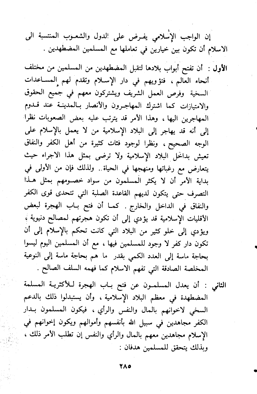 الأول: أن تفتح أبواب بلادها لتقبل المضطهدين من المسلمين من مختلف أنحاء العالم، فتؤويهم في دار الإسلام وتقدم لهم المساعدات السخيَّة، وفرص العمل الشريف ويشتركون معهم في جميع الحقوق والامتيازات كما اشترك المهاجرون والأنصار بالمدينة عند قدوم المهاجرين إليها، وهذا الأمر قد يترتب عليه بعض الصعوبات نظرا إلى أنه قد يهاجر إلى البلاد الإسلامية من لا يعمل بالإسلام على الوجه الصحيح، ونظرا لوجود فئات كثيرة من أهل الكفر والنفاق تعيش بداخل البلاد الإسلامية، ولا ترضى بمثل هذا الإجراء حيث يتعارض مع رغباتها ومنهجها في الحياة، ولذلك فإن من الأولى في بداية الأمر أن لا يكثر المسلمون من سواد خصومهم بمثل هذا التصرف حتى يتكون لديهم القاعدة الصلبة التي تتحدى قوى الكفر والنفاق في الداخل والخارج، كما أن فتح باب الهجرة لبعض الأقليات الإسلامية قد يؤدي إلى أن تكون هجرتهم لمصالح دنيوية ويؤدي إلى خلو كثير من البلاد التي كانت تحكم بالإسلام إلى أن تكون دار كفر لا وجود للمسلمين فيها، مع أن المسلمين اليوم ليسوا بحاجة ماسة إلى العدد الكمي بقدر ما هم بحاجة ماسة إلى النوعية المخلصة الصادقة التي تفهم الإسلام كما فهمه السلف الصالح.