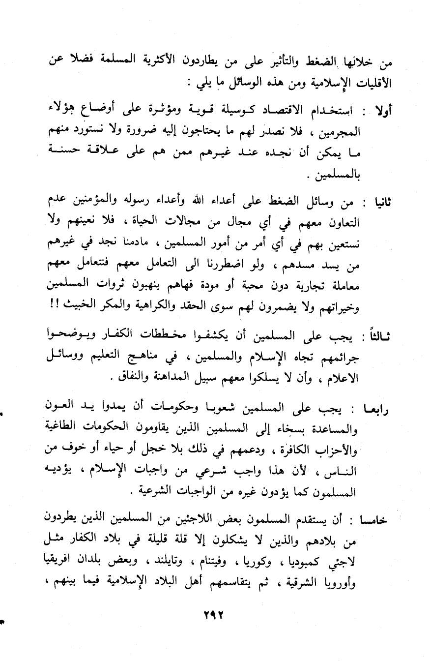 رابعًا: يجب على المسلمين شعوبًا وحكومات أن يمدوا يد العون والمساعدة بسخاء إلى المسلمين الذين يقاومون الحكومات الطاغية والأحزاب الكافرة، ودعمهم في ذلك بلا خجل أو حياء أو خوف من الناس، لأن هذا واجب شرعي من واجبات الإسلام، يؤديه المسلمون كما يؤدون غيره من الواجبات الشرعية.