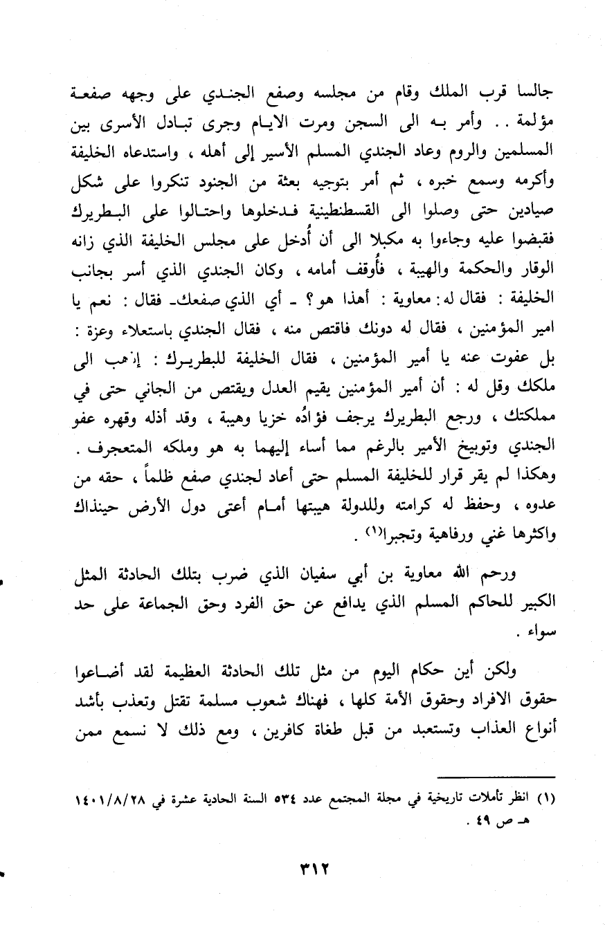 جالسا قرب الملك وقام من مجلسه وصفع الجندي على وجهه صفعة مؤلمة، وأمر به إلى السجن ومرت الأيام وجرى تبادل الأسرى بين المسلمين والروم وعاد الجندي المسلم الأسير إلى أهله، واستدعاه الخليفة وأكرمه وسمع خبره، ثم أمر بتوجيه بعثة من الجنود تنكروا على شكل صيادين حتى وصلوا إلى القسطنطينية فدخلوها واحتالوا على البطريرك فقبضوا عليه وجاءوا به مكبَّلا إلى أن أدخل على مجلس الخليفة الذي زانه الوقار والحكمة والهيبة فأوقف أمامه، وكان الجندي الذي أسر بجانب الخليفة: فقال له: معاوية أهذا هو؟ أي الذي صفعك فقال: نعم يا أمير المؤمنين فقال له دونك فاقتص منه، فقال الجندي باستعلاء وعزة: بل عفوت عنه يا أمير المؤمنين، فقال الخليفة للبطريرك: اذهب إلى ملكك وقل له: إن أمير المؤمنين يقيم العدل ويقتص من الجاني حتى في مملكته، ورجع البطريرك يرجف فؤاده خزيًا وهيبة، وقد أذله وقهره عفو الجندي وتوبيخ الأمير بالرغم مما أساء إليهما به هو وملكه المتعجرف وهكذا لم يقر قرار للخليفة المسلم حتى أعاد لجندي صفع ظلمًا، حقه من عدوه، وحفظ له كرامته وللدولة هيبتها أمام أعتى دول الأرض حينذاك وأكثرها غنى ورفاهية وتجبرا (¬1).