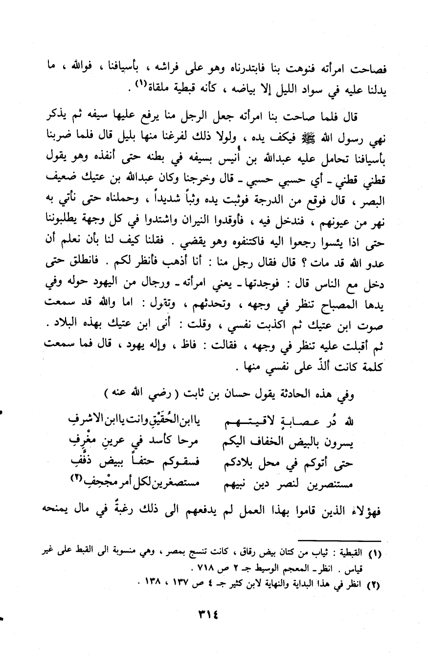 فصاحت امرأته فنوهت بنا فابتدرناه وهو على فراشه، بأسيافنا فوالله ما يدلنا عليه في سواد الليل إلا بياضه، كأنه قبطية ملقاة (¬1).