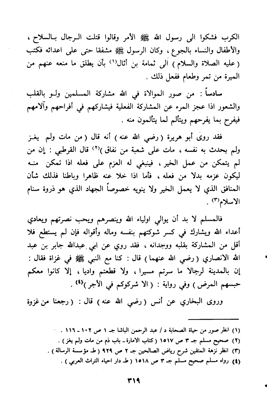 فالمسلم لا بد أن يوالي أولياء الله وينصرهم ويحب نصرتهم ويعادي أعداء الله ويشارك في كسر شوكتهم بنفسه وماله وأقواله فإن لم يستطع فلا أقل من المشاركة بقلبه ووجدانه، فقد روي عن أبي عبد الله جابر بن عبد الله الأنصاري رضي الله عنهما قال: كنا مع النبي - صلى الله عليه وسلم - في غزاة فقال: إن بالمدينة لرجالا ما سرتم مسيرا، ولا قطعتم واديا، إلا كانوا معكم حبسهم المرض وفي رواية إلا شركوكم في الأجر (¬4).
