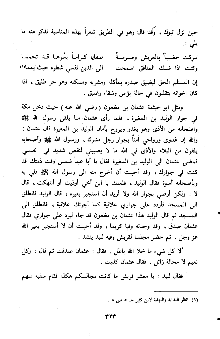ومثل أبي خيثمة عثمان بن مظعون رضي الله عنه حيث دخل مكة في جوار الوليد بن المغيرة، فلما رأى عثمان ما يلقى رسول الله - صلى الله عليه وسلم - وأصحابه من الأذى وهو يغدو ويروح بأمان الوليد بن المغيرة قال عثمان: والله إن غدوي ورواحي آمنا بجوار رجل مشرك، ورسول الله - صلى الله عليه وسلم - وأصحابه يلقون من البلاء والأذى في الله ما لا يصيبني لنقص شديد في نفسي فمضى عثمان إلى الوليد بن المغيرة فقال: يا أبا عبد شمس وفت ذمتك قد كنت في جوارك وقد أحببت أن أخرج منه إلى رسول الله - صلى الله عليه وسلم - فلي به وبأصحابه أسوة فقال الوليد فلعلك يا ابن أخي أوذيت أو انتهكت قال لا: ولكن أرضى بجوار الله ولا أريد أن استجير بغيره، قال الوليد فانطلق إلى المسجد فاردد على جواري علانية كما أجرتك علانية، فانطلق إلى المسجد ثم قال الوليد هذا عثمان بن مظعون قد جاء ليرد على جواري فقال عثمان صدق، وقد وجدته وفيًّا كريما، وقد أحببت أن لا أستجير بغير الله عز وجل، ثم حضر مجلسا لقريش وفيه لبيد ينشد.