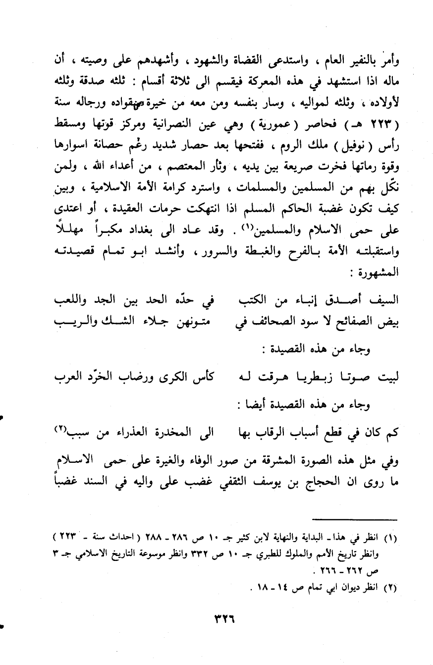 وأمر بالنفير العام، واستدعى القضاة والشهود، وأشهدهم على وصيته، أن ماله إذا استشهد في هذه المعركة فيقسم إلى ثلاثة أقسام ثلثه صدقة وثلثه لأولاده، وثلثه لمواليه، وسار بنفسه ومن معه من خيرة قواده ورجاله سنة (223) هـ فحاصر عمورية وهي عين النصرانية ومركز قوتها ومسقط رأس نوفيل ملك الروم، ففتحها بعد حصار شديد رغم حصانة أسوارها وقوة رماتها فخرت صريعة بين يديه، وثأر المعتصم، من أعداء الله ولمن نكل بهم من المسلمين والمسلمات، واسترد كرامة الأمة الإسلامية وبين كيف تكون غضبة الحاكم المسلم إذا انتهكت حرمات العقيدة أو اعتدى على حمى الإسلام والمسلمين (¬1) وقد عاد إلى بغداد مكبرا مهللا واستقبلته الأمة بالفرح والغبطة والسرور، وأنشد أبو تمام قصيدته المشهورة:
